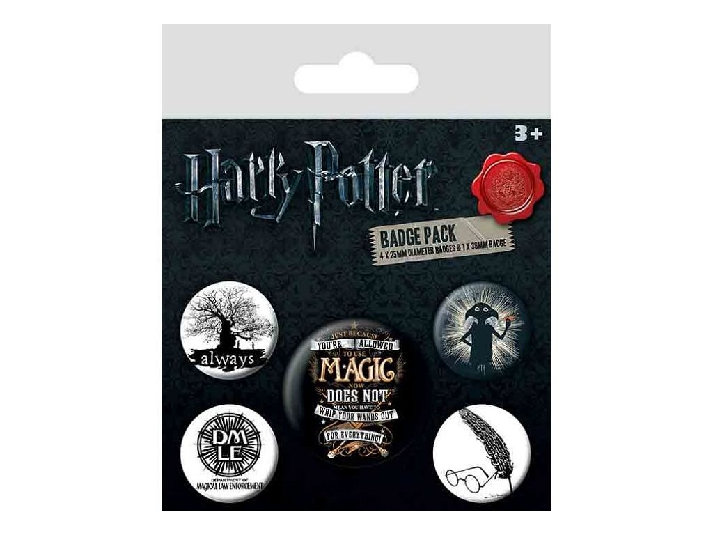 Sada obsahuje 5 kulatých placek (1 větší a 4 menší) se symboly z Harry Pottera, skvělý dárek a identifikace pro každého fanouška příběhů z Bradavic!
