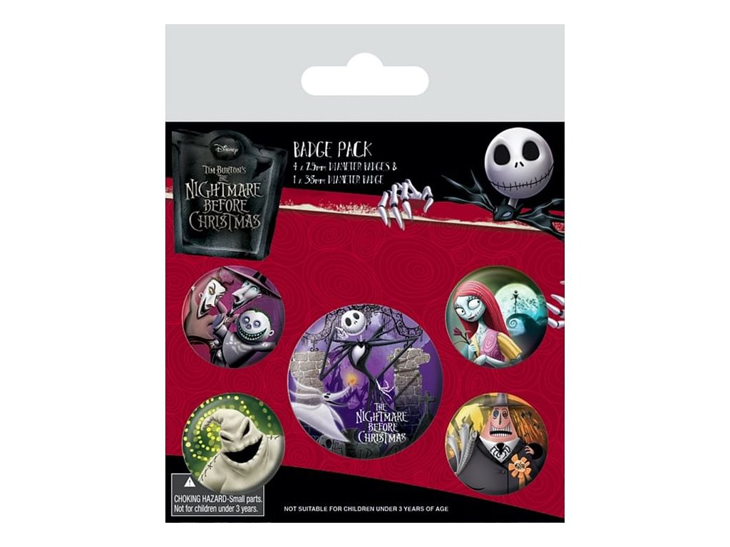 Sada pěti placek s motivem oblíbeného fantasy filmu Nightmare Before Christmas (Ukradené Vánoce). Zaručeně potěší všechny fanoušky nevšedních filmů a pohádek od Tima Burtona. Balení obsahuje jednu placku o průměru 3,8 cm a čtyři placky o průměru 2,5 cm.