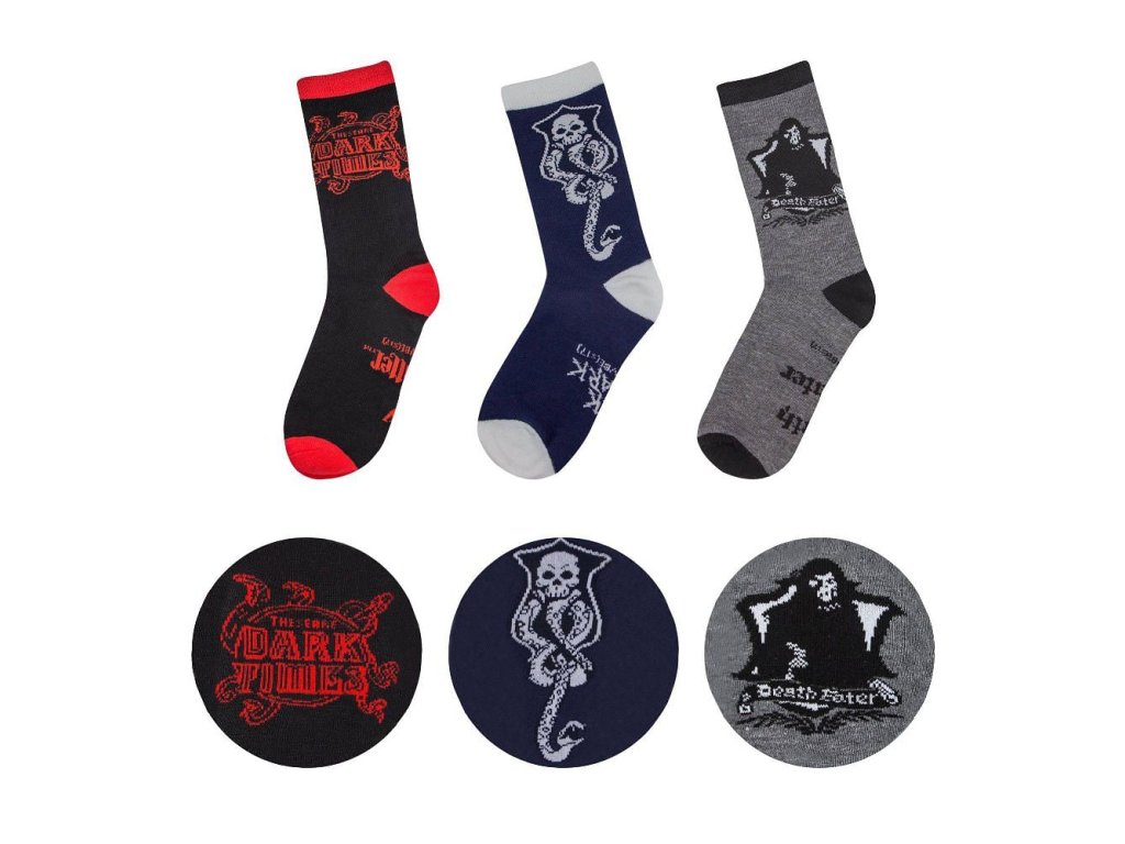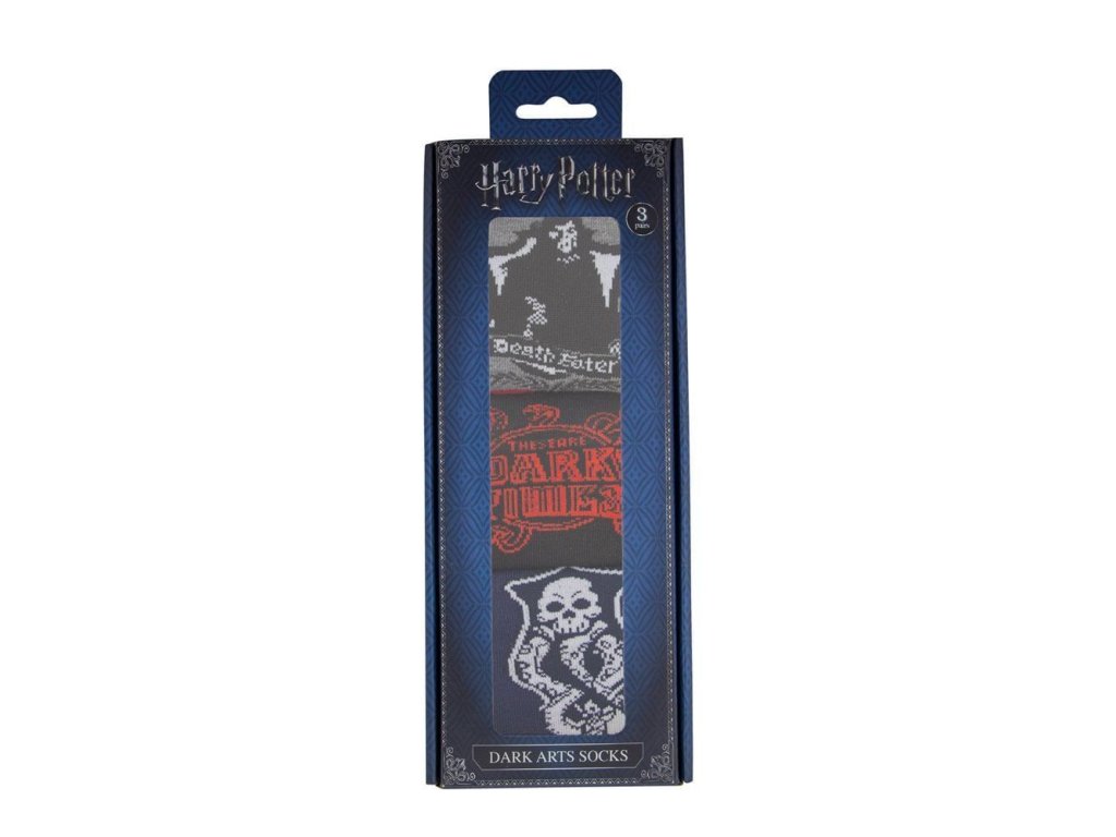 Sada obsahuje 3 páry ponožek v grafice Dark Arts podle příběhů o Harry Potterovi ze školy čar a kouzel v Bradavicích.