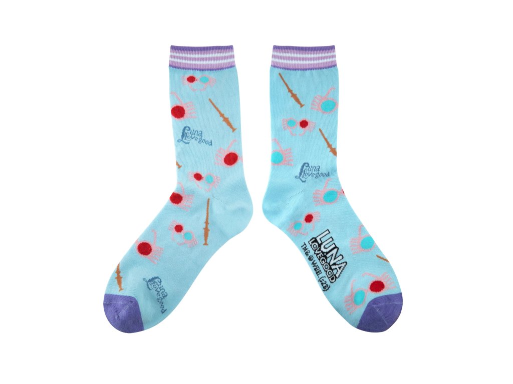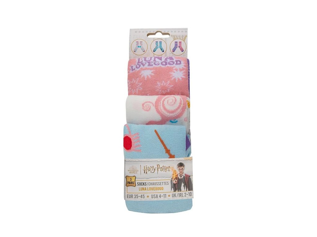 V sadě najdeš 3 páry krásně střelených ponožek od Lenky Láskorádové, věrné kamarádky Harryho Pottera. Na ponožkách nechybí Lenčina kouzelnická hůlka nebo třaba brýle Strašibrýle. Ponožky jsou vhodné pro velikost nohou 35 až 45.
