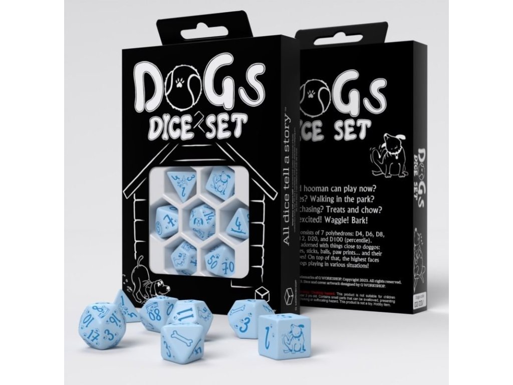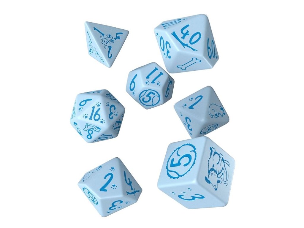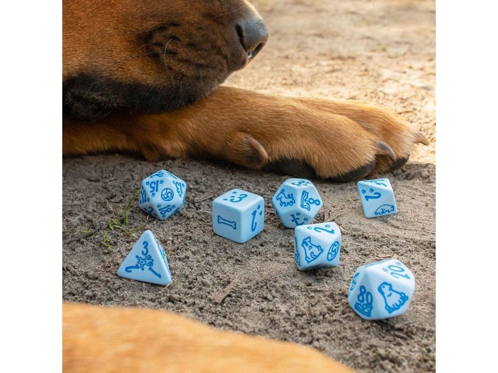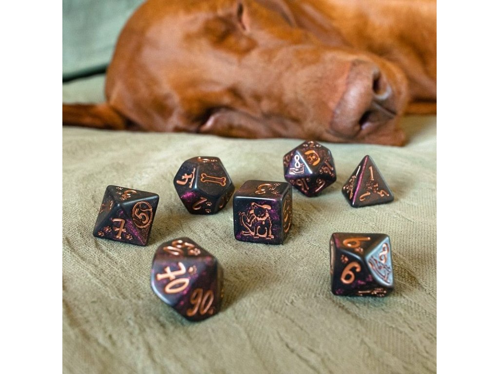 Sada 7 mnohostěnných psích kostek je věnována našim věrným, chlupatým kamarádům a jejich veselým kouskům. Jsou vhodné pro hry na hrdiny i deskové hry. Každou kostku zdobí jedinečné symboly, jako jsou např. tlapky, kost nebo míček. Sada obsahuje čtyř, šesti, osmi, desíti, dvanácti, dvaceti stěnnou a procentovou kostku. Luna verze je černá, s fialovým třpytem a měděnými symboly. Max verze je světle modrá s tmavě modrými znaky.