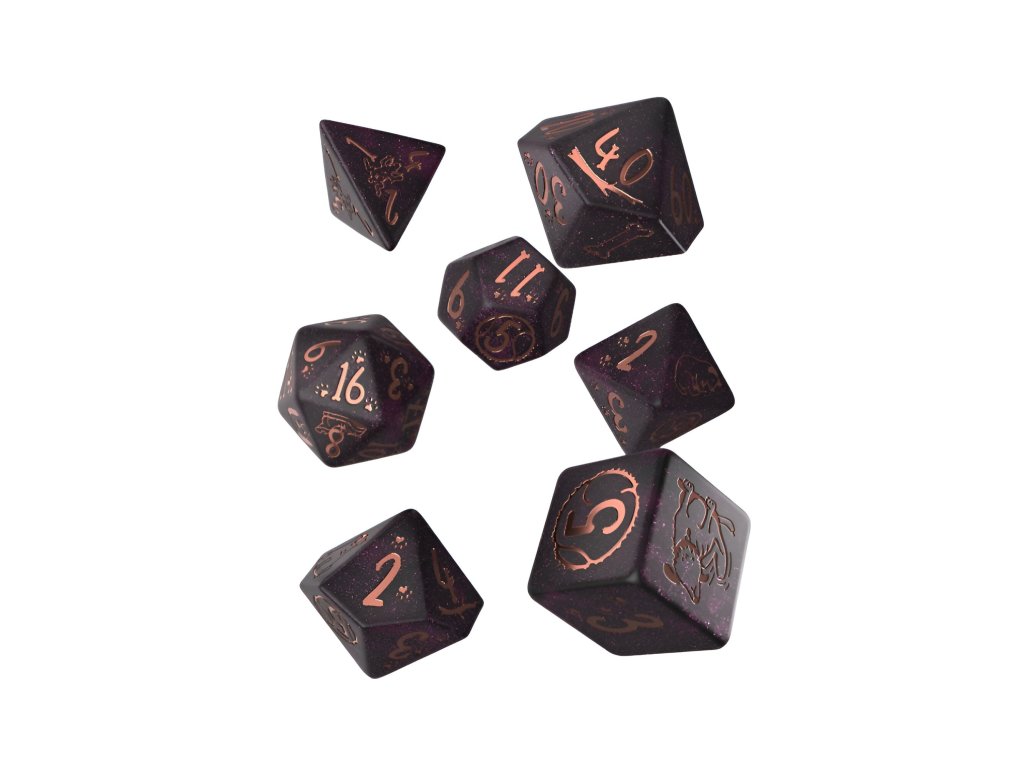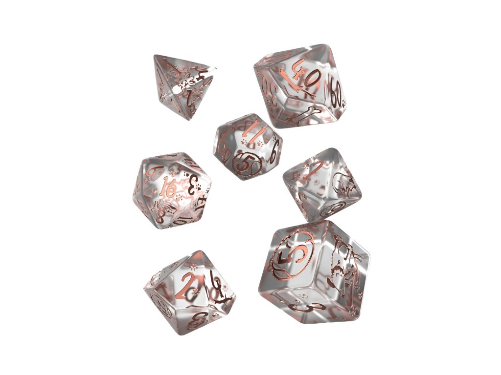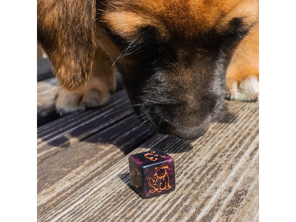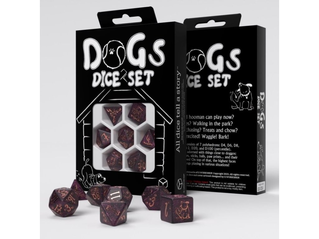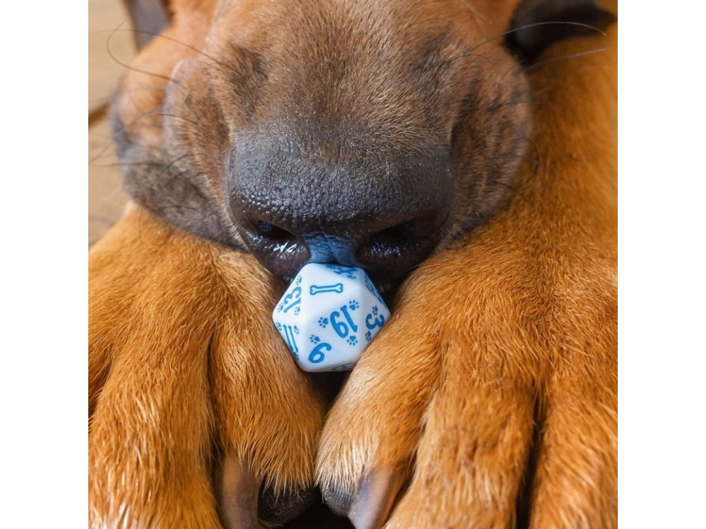 Sada 7 mnohostěnných psích kostek je věnována našim věrným, chlupatým kamarádům a jejich veselým kouskům. Jsou vhodné pro hry na hrdiny i deskové hry. Každou kostku zdobí jedinečné symboly, jako jsou např. tlapky, kost nebo míček. Sada obsahuje čtyř, šesti, osmi, desíti, dvanácti, dvaceti stěnnou a procentovou kostku. Luna verze je černá, s fialovým třpytem a měděnými symboly. Max verze je světle modrá s tmavě modrými znaky.