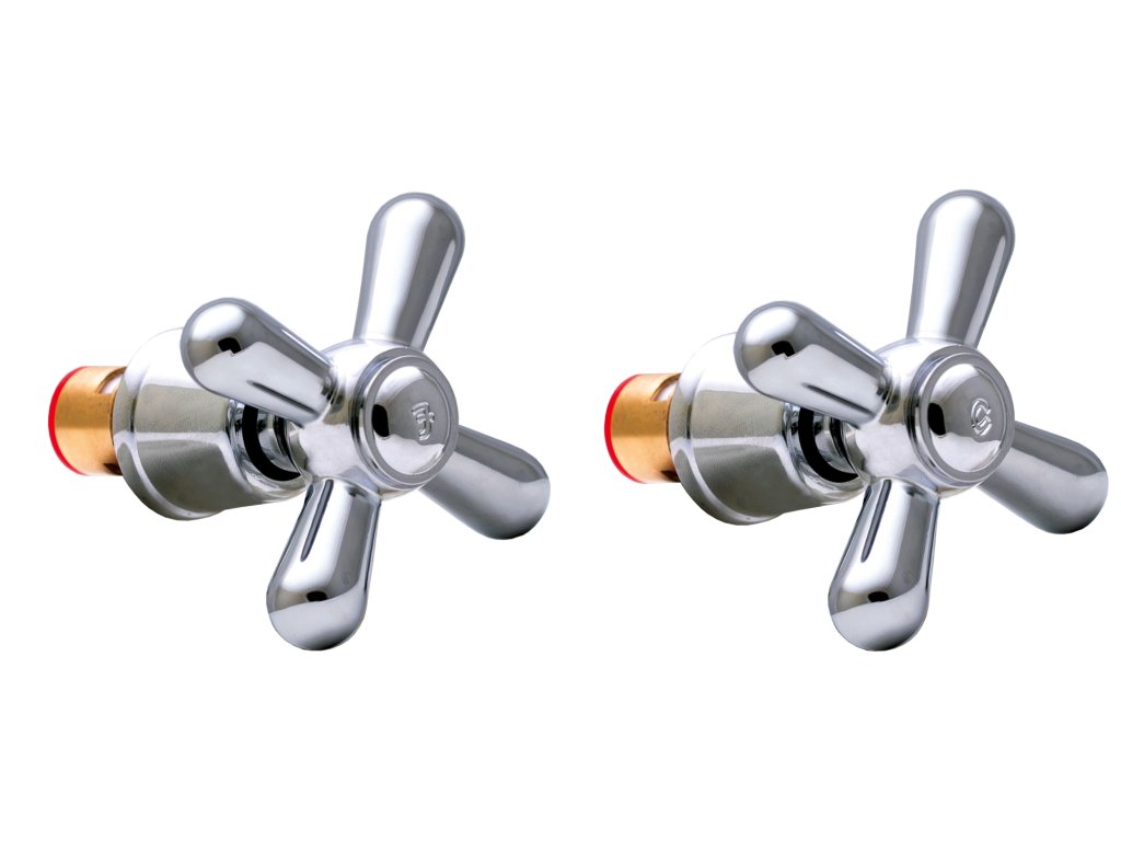 Univerzální mosazné rukojeti s křížovým šlifem a krycí „sukýnkou“ Mixxus DOMINOX HANDLES SET jsou určeny k výměně rukojetí ve standardních vodovodních bateriích.