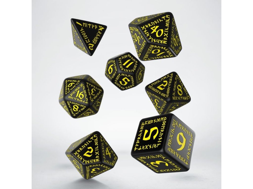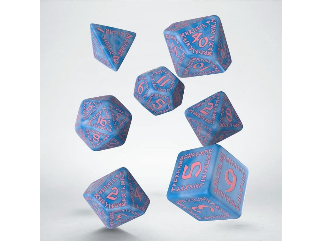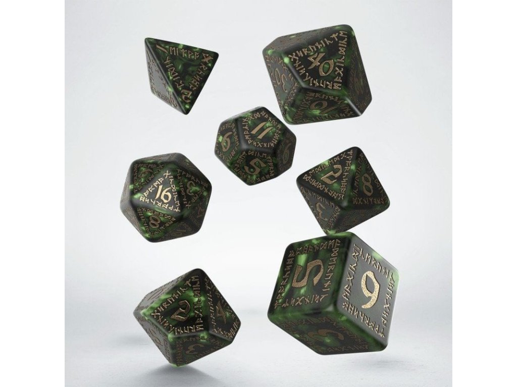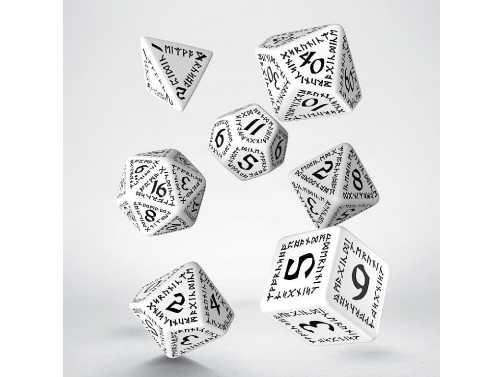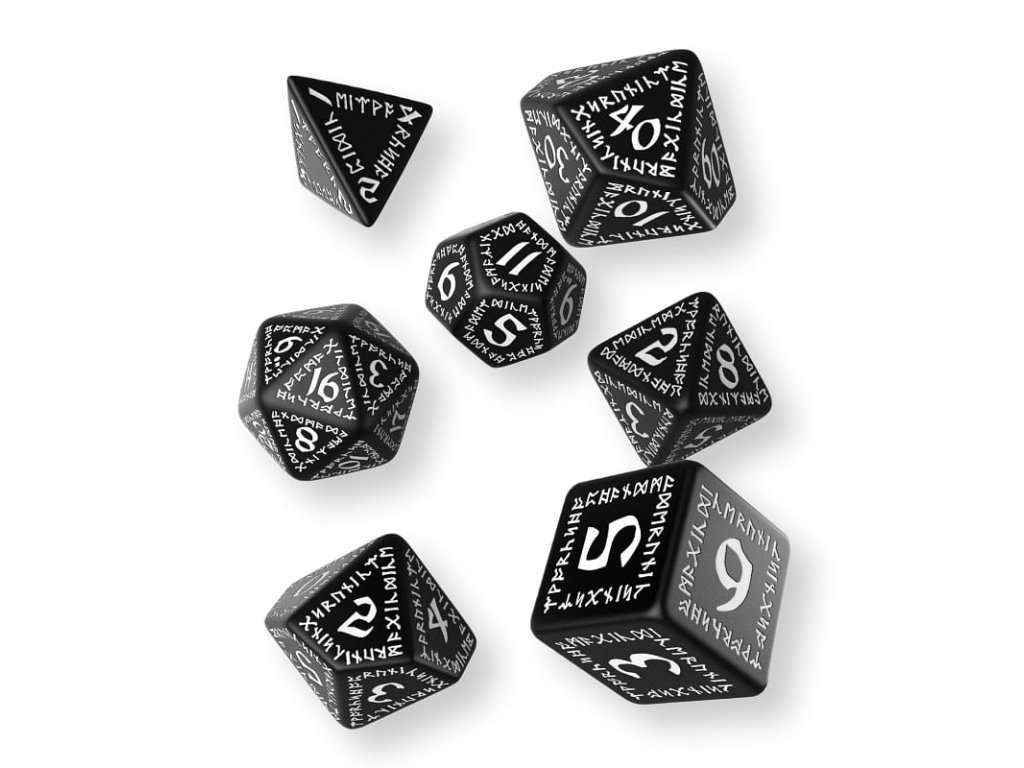 Sada precizně vyvedených kostek s drobounkými gravírovanými nápisy v trpasličích runách, ideální doplněk pro hráče her na hrdiny. Sada obsahuje sedm kostek: čtyř, šesti, osmi, desíti, dvanácti, dvaceti stěnnou a procentovou kostku. Kostky jsou k mání v několika barevných kombinacích. Barvy jsou uvedeny vždy v pořadí: barva podkladu-barva run.