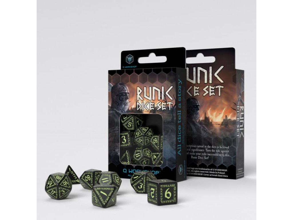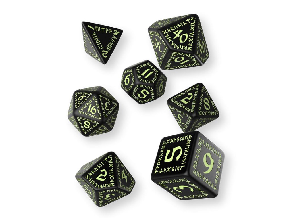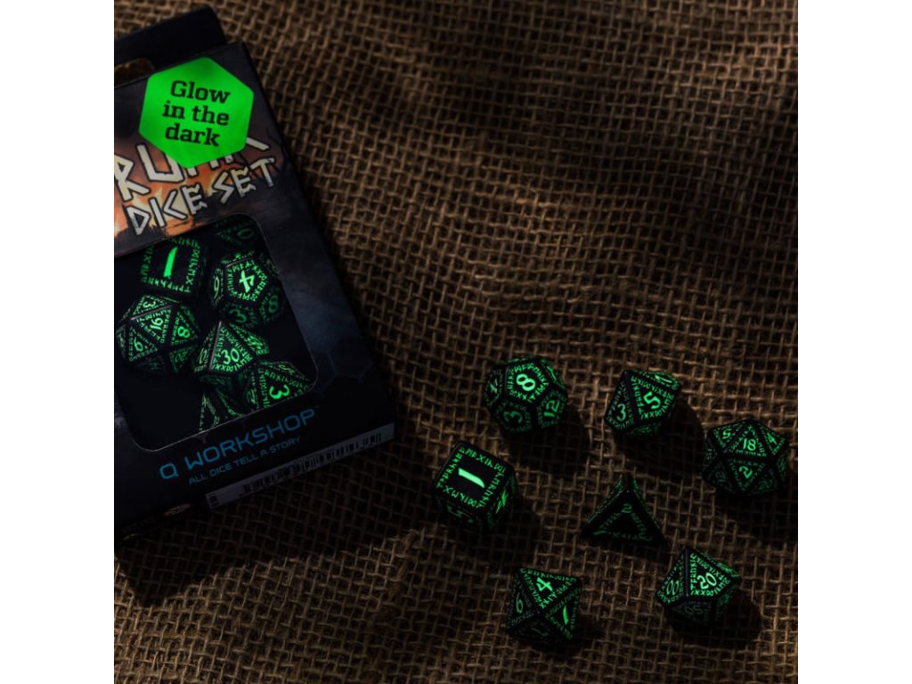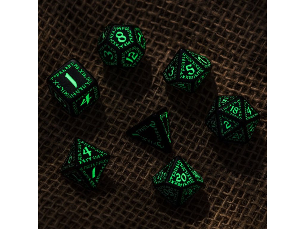 Sada precizně vyvedených kostek s drobounkými gravírovanými nápisy v trpasličích runách, ideální doplněk pro hráče her na hrdiny. Sada obsahuje sedm kostek: čtyř, šesti, osmi, desíti, dvanácti, dvaceti stěnnou a procentovou kostku. Černé kostky s čísly a ornamenty vyvedenými fluorescenční barvou - ve tmě svítí!