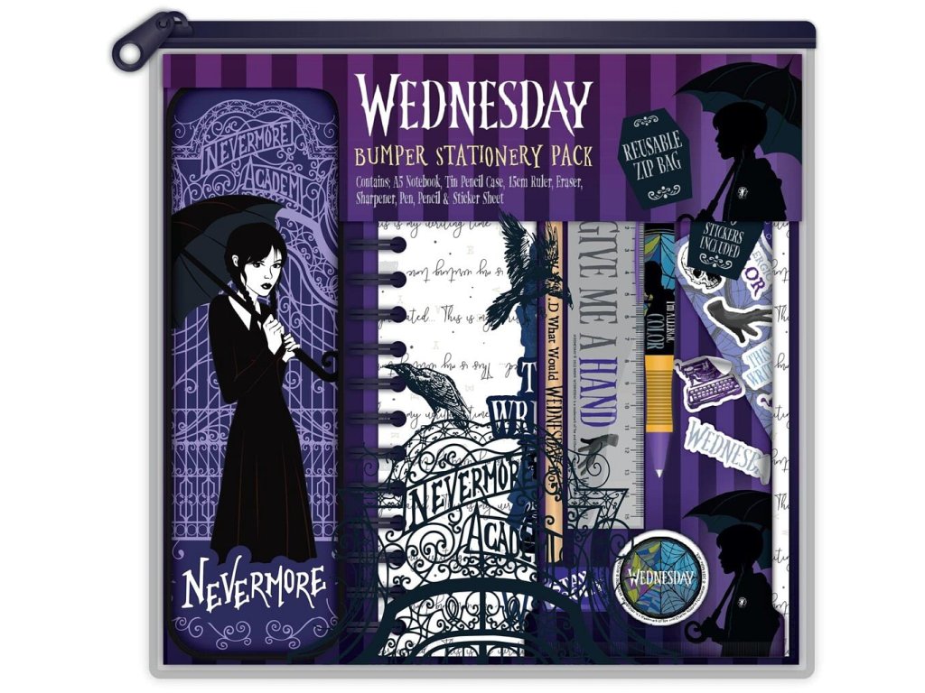 Vyraž do školy v tajemném a elegantním stylu Wednesday Addams a ukáž, že i školní potřeby mohou být gotický. Tento kompletní set obsahuje vše, co potřebuješ k tomu, abys přežil na tajemné škole Nevermore! Udělej radost kamarádovi nebo i sobě a zapiš si jakýkoliv důležitý moment! Balení obsahuje: 1x blok A5 1x plechový penál 1x pravítko 15 cm 1x guma 1x ořezávátko 1x tužka 1x arch samolepek