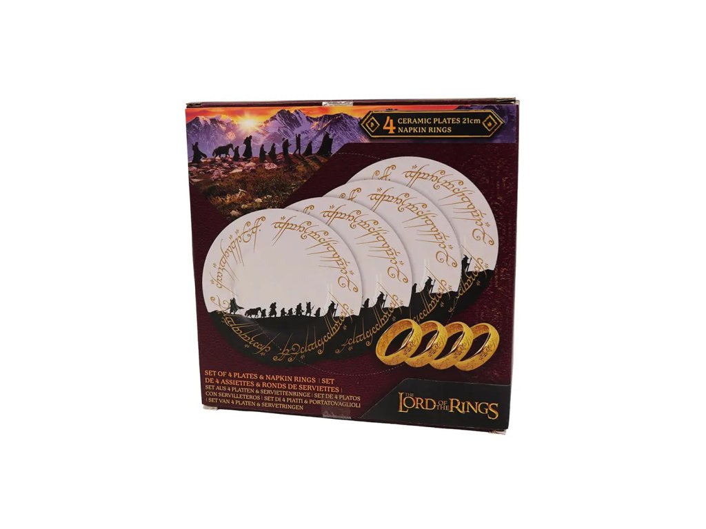 Vychutnej si snídani, druhou snídani, oběd, svačinu i večeři tak, jak to mají hobiti nejraději! Tato pečlivě navržená sada potěší každého milovníka Středozemě, ať už chystáš slavnostní hostinu v Roklince nebo tě překvapili nečekaní hosté u Dna pytle. Součástí balení jsou 4 keramické talíře o průměru 21 cm, zdobené ikonickým motivem Společenstva na jejich cestě za zničením Prstenu. Vyrobeny jsou z kvalitní glazované keramiky. A protože každý správný chod si zaslouží i elegantní prezentaci, najdeš v sadě také 4 kroužky ze zinkové slitiny na ubrousky o velikosti 4 cm – inspirované samotným Prstenem moci, včetně detailního gravírování. Talíře jsou vhodné do myčky a mikrovlnky.