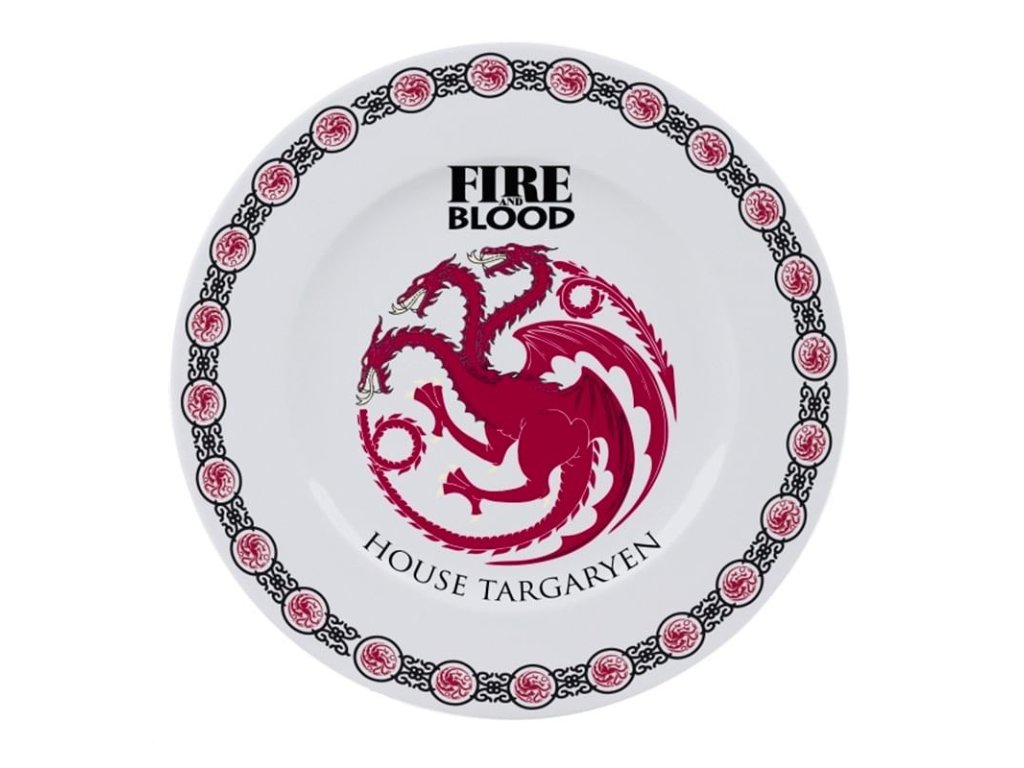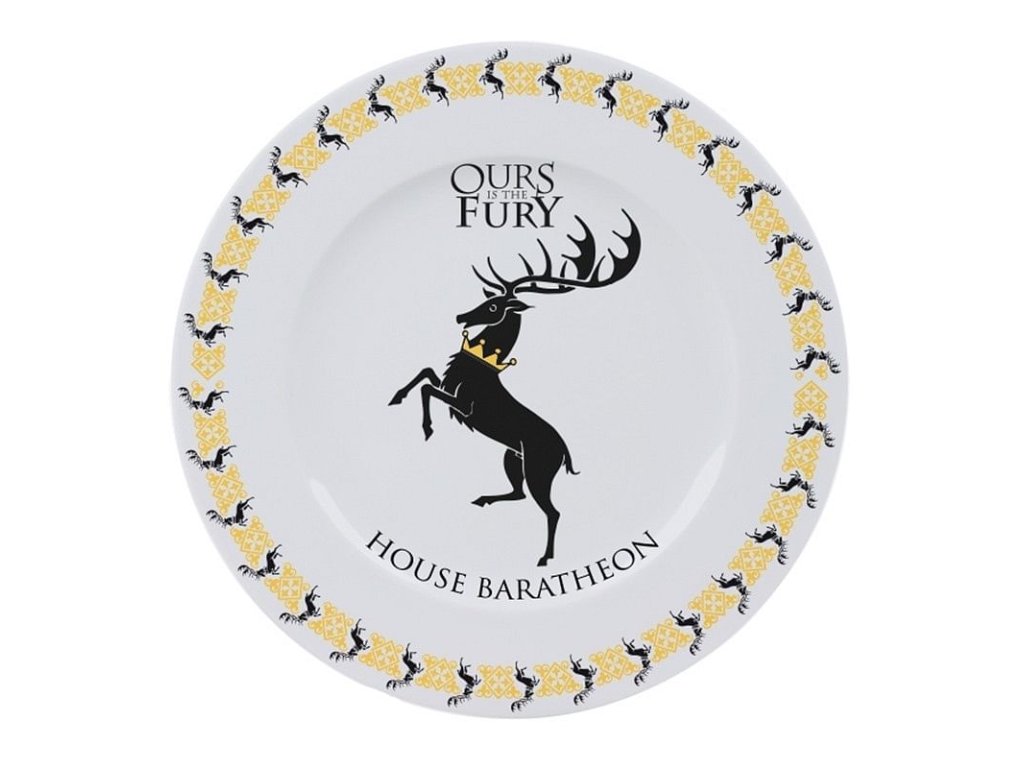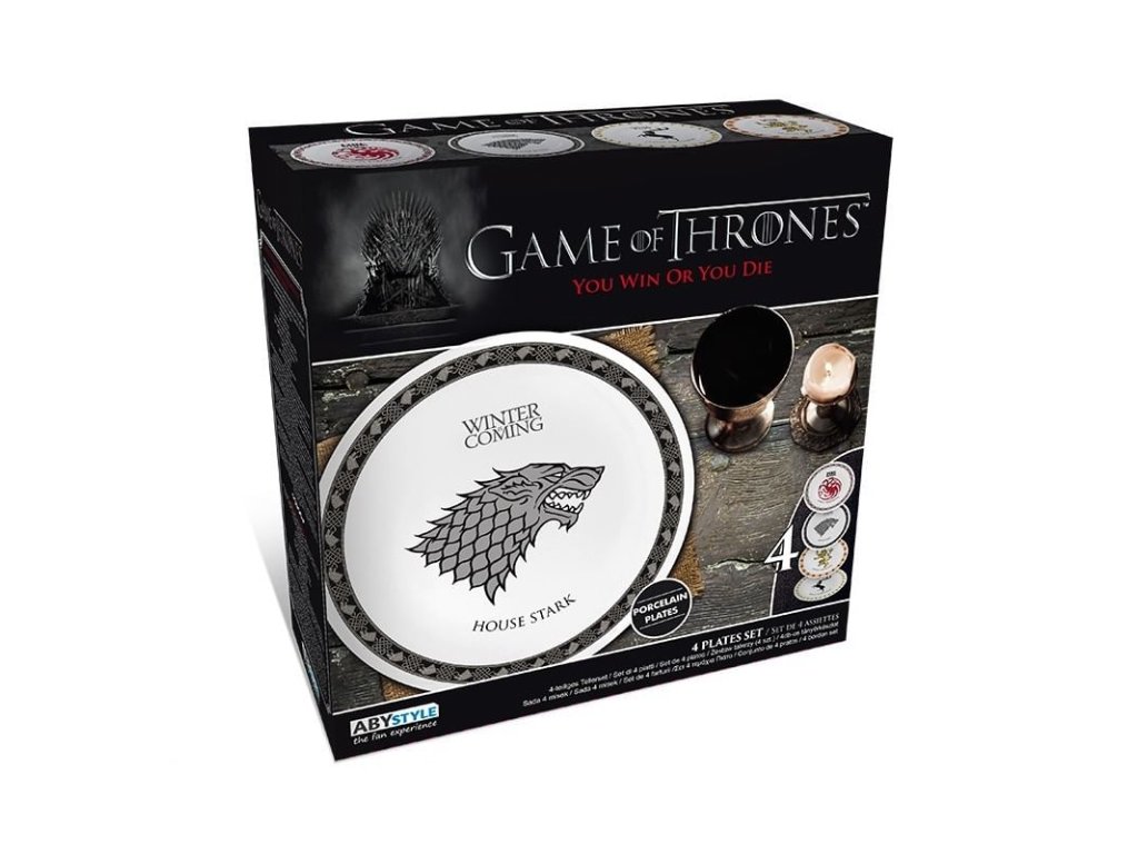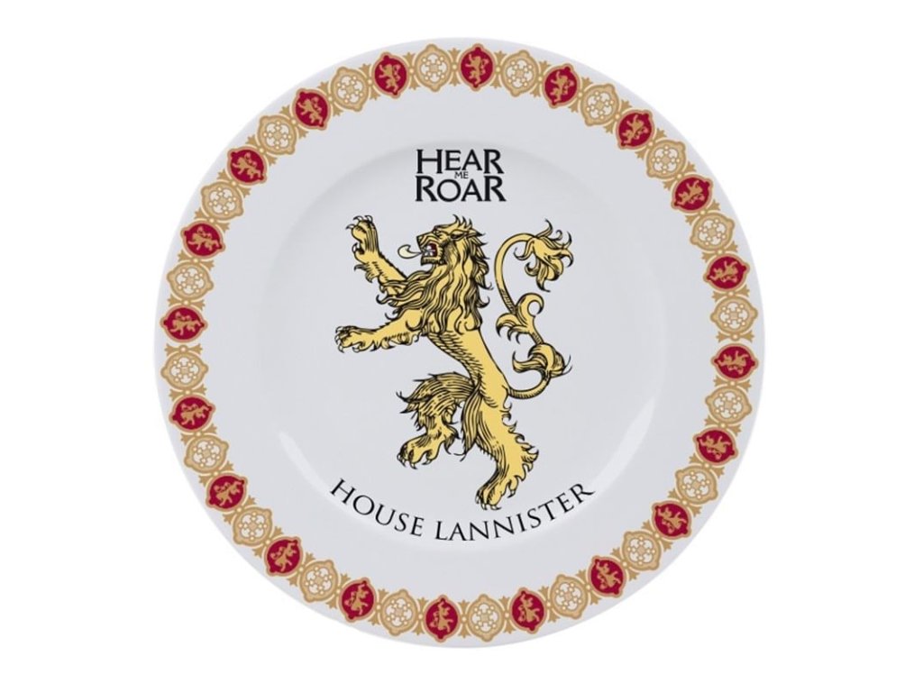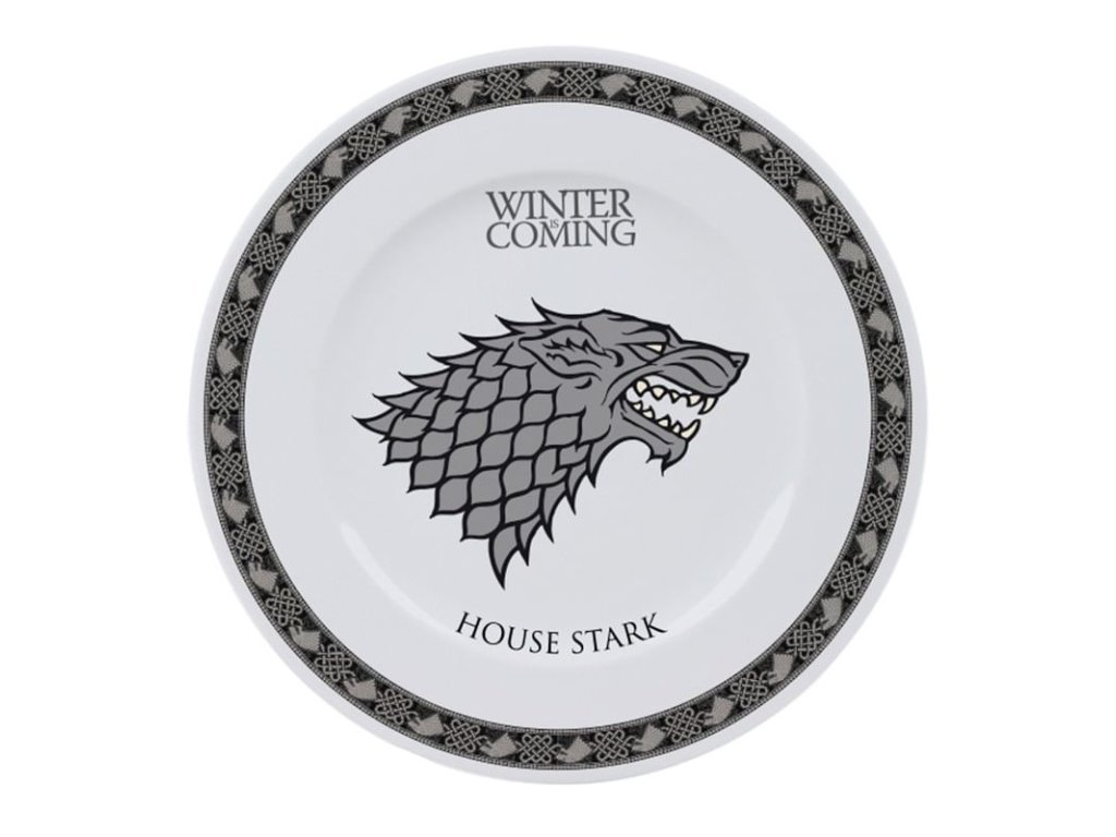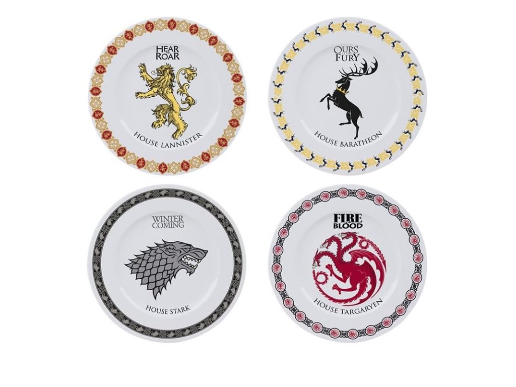 Hodujte jako v Sedmi královstvích a ozdobte svojí kuchyň talíři Game of Thrones! Sadu tvoří čtyř talíře s motivy rodů Západozemí: Stark, Targaryen, Lannister a Baratheon. Talíře jsou vhodné do myčky nádobí a mikrovlnné trouby.