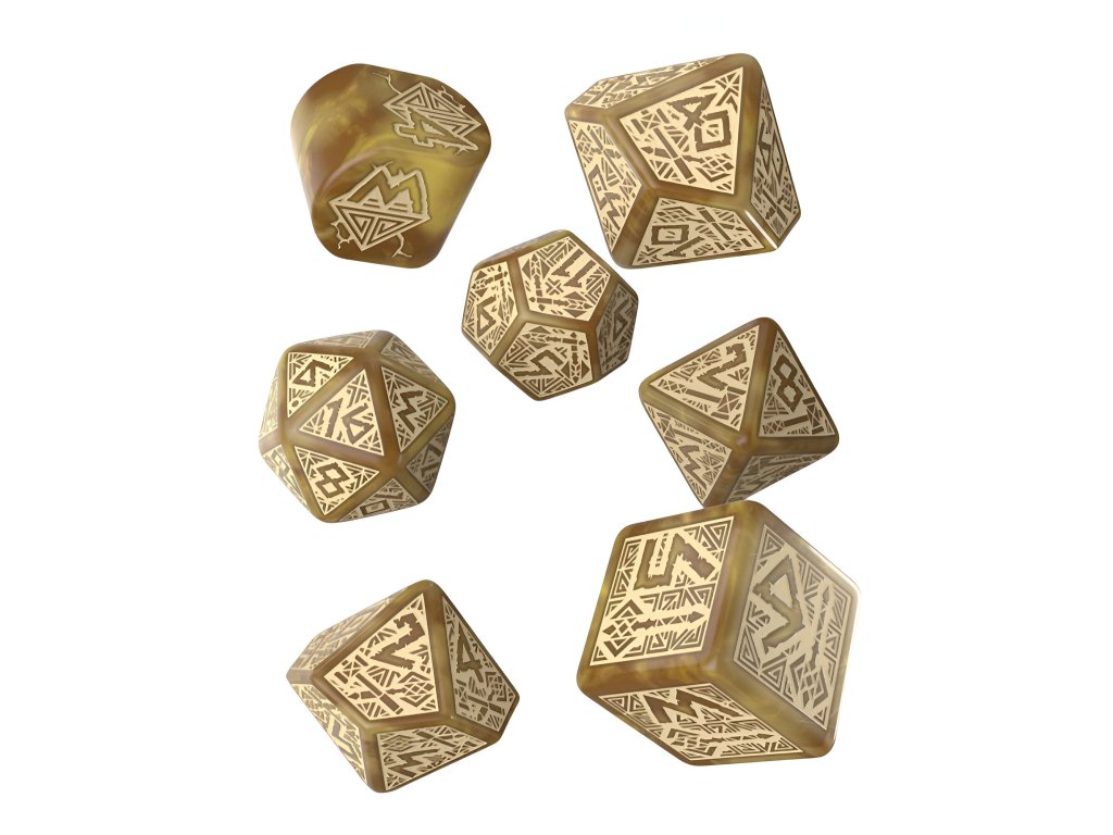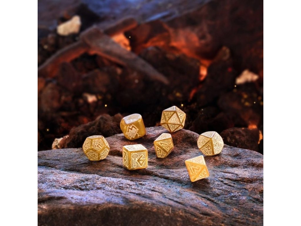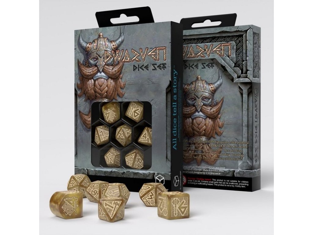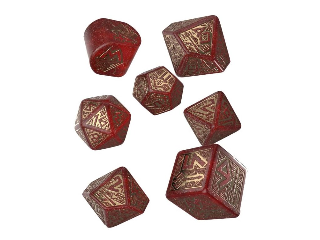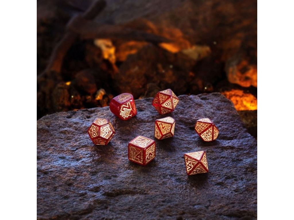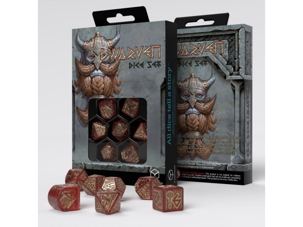 Z hlubin hor se vynořil nový záblesk zručnosti trpaslíků. Tyto kostky ti zajistí vítězství! Sadu krásných mnohostěnných kostek zdobí trpasličí symbolika a budou ti skvělými pomocníky při dobrodružstvích v tajuplném podzemí i kdekoliv jindy. Skvělé kostky pro hry na hrdiny! Kostky jsou ve vínové a zlaté barvě. Balení obsahuje: čtyř (moderní), šesti, osmi, desíti, dvanácti, dvaceti stěnnou a procentovou kostku.