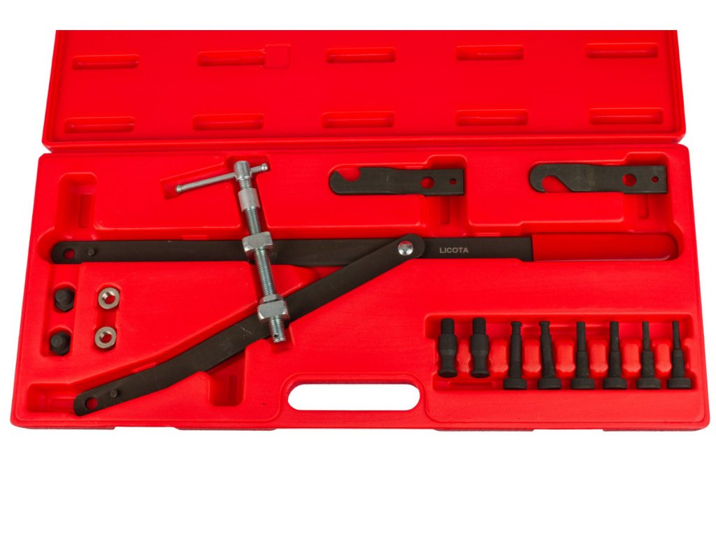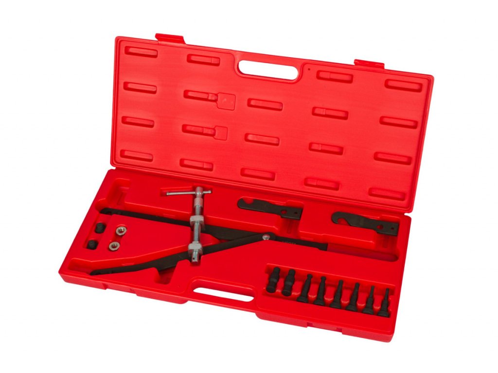 Univerzální sada držáku řemenice a spojky ventilátoru je nezbytná pro snadnou a efektivní práci s motorem. Umožňuje pohodlnou montáž a demontáž spojky ventilátoru a spolehlivě přidržuje řemenici vačkové hřídele. Díky univerzálním rozměrům je vhodná pro široké spektrum automobilů.