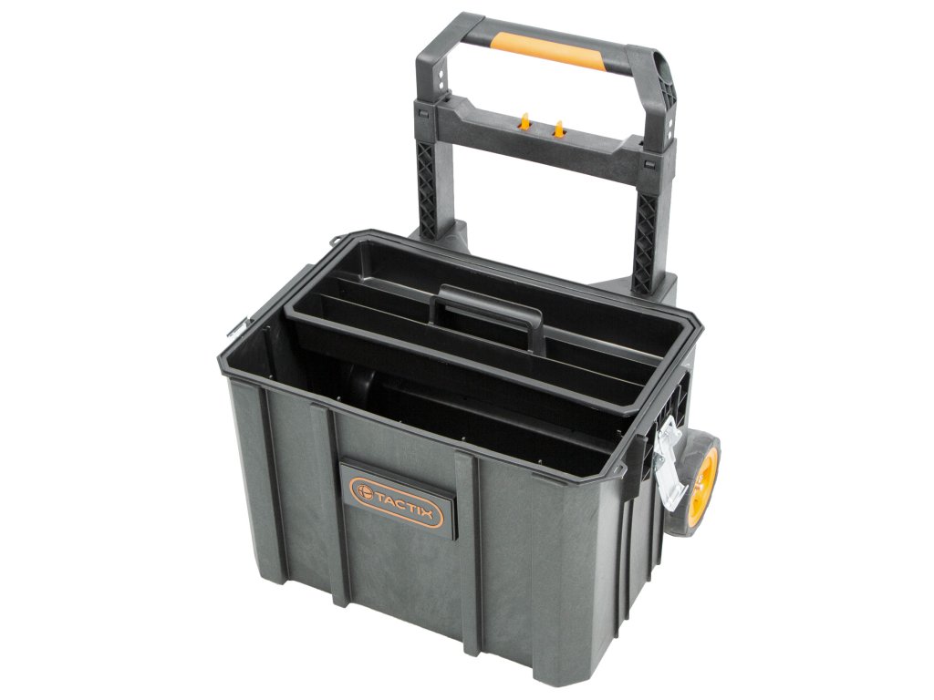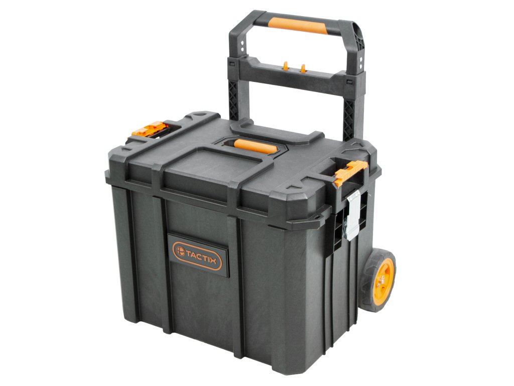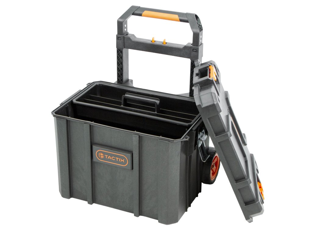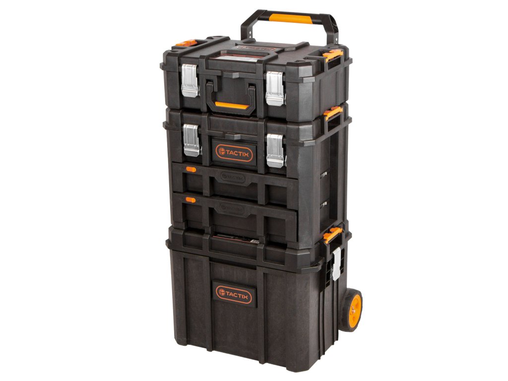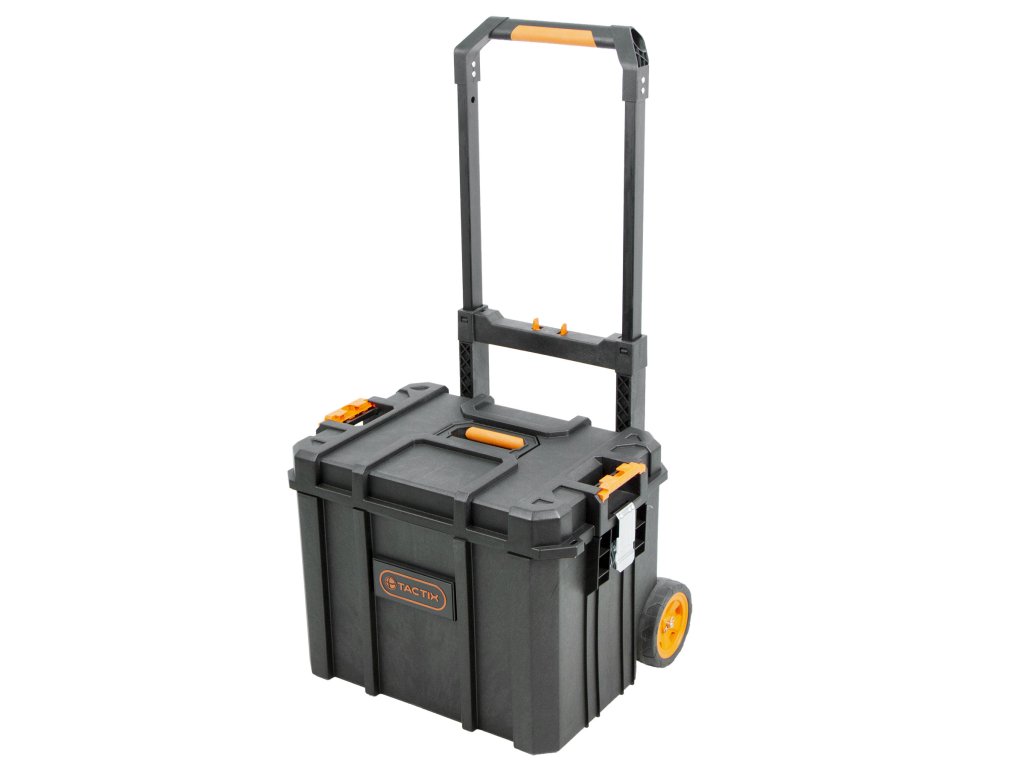 Hlavní výhodou kufrů od značky Tactix je jejich variabilita úložných prostorů, vodotěsnost a snadná manipulace celé sady díky madlu a kolečkům.