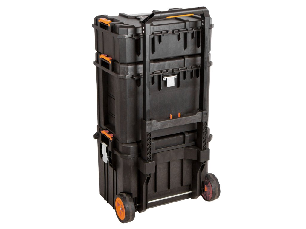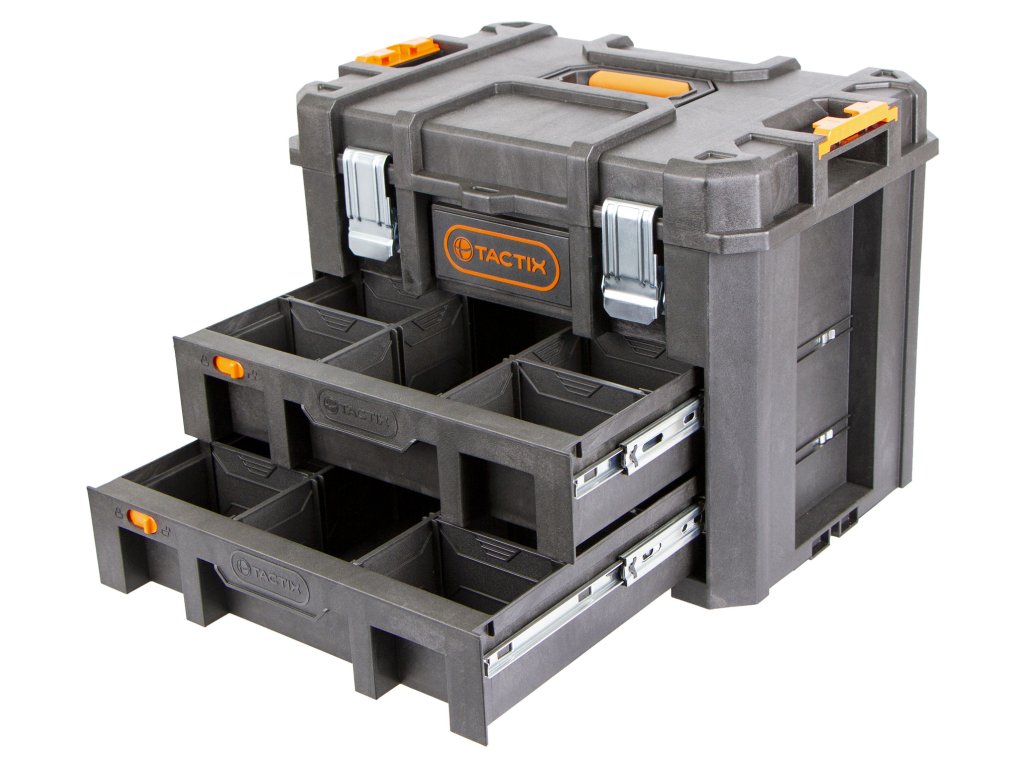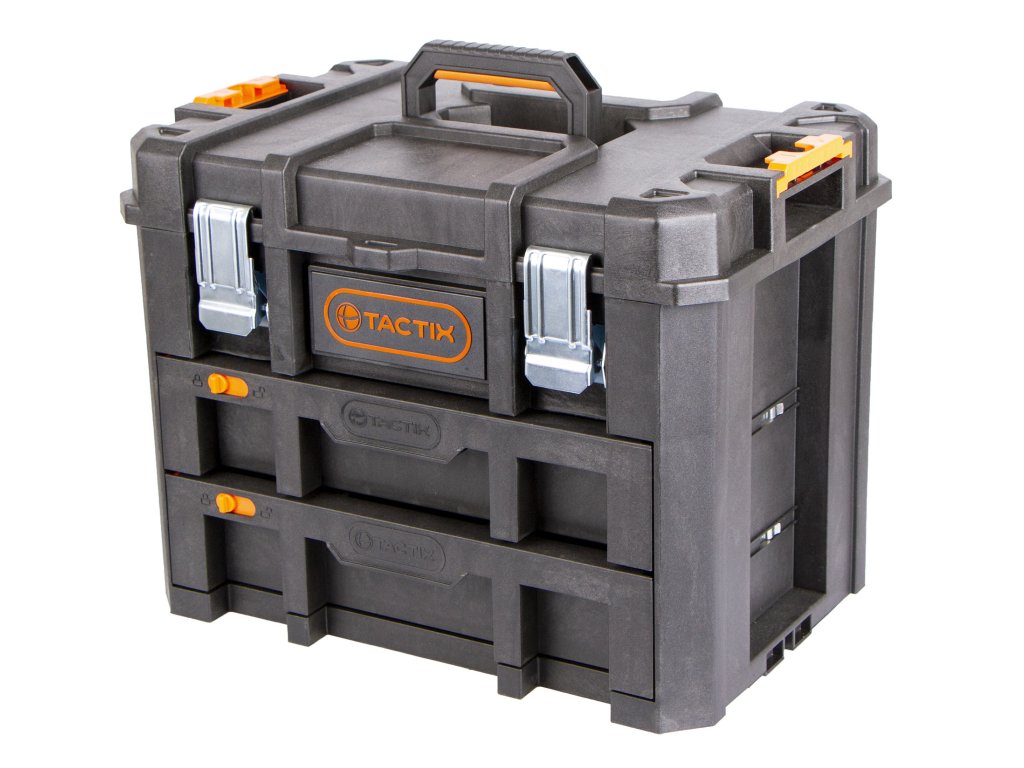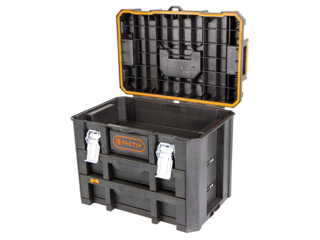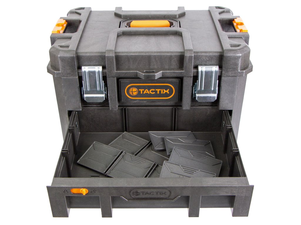 Hlavní výhodou kufrů od značky Tactix je jejich variabilita úložných prostorů, vodotěsnost a snadná manipulace celé sady díky madlu a kolečkům.