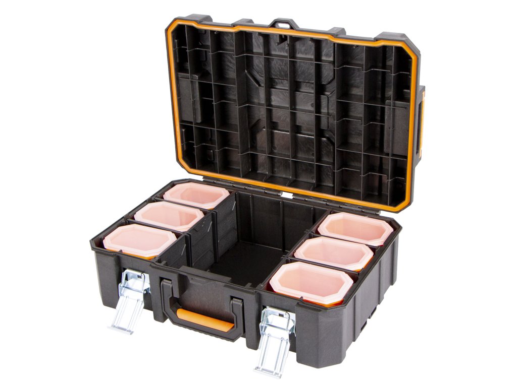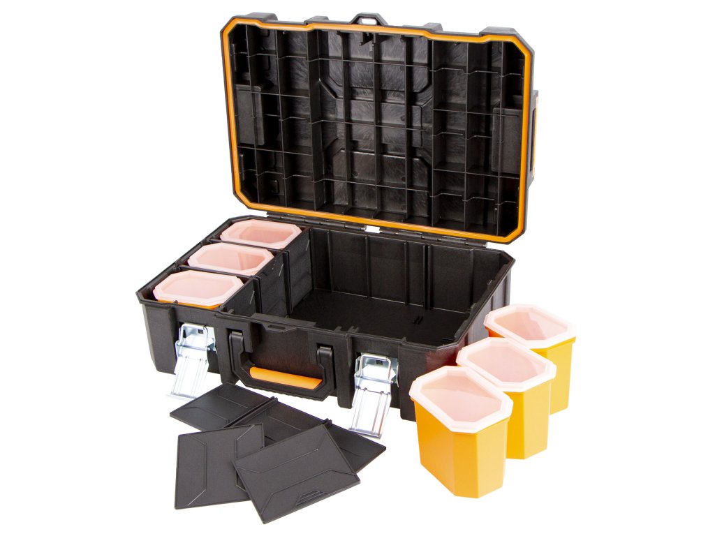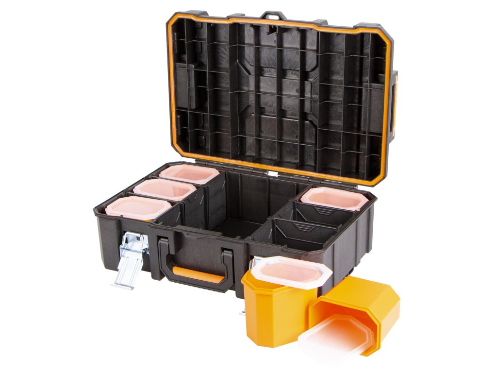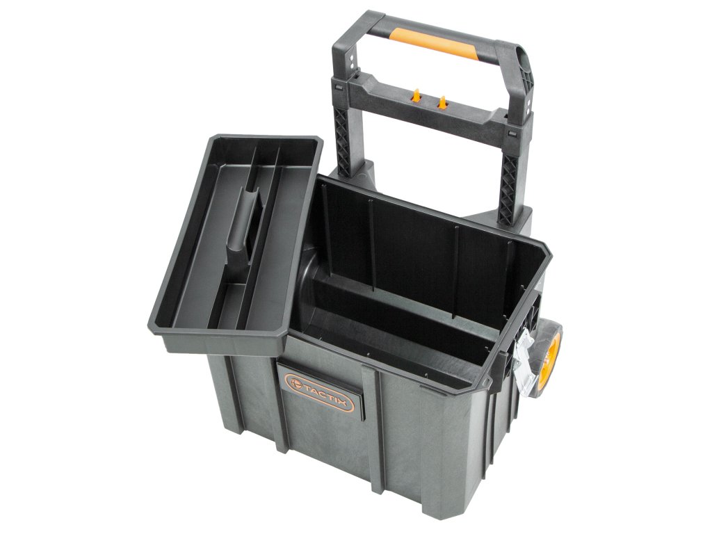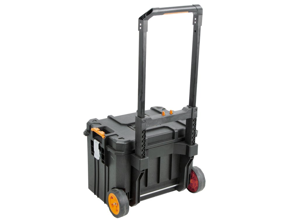 - Velký kufr s kolečky, který má velký úložný prostor a odnímatelnou přepravku pro drobnější nářadí