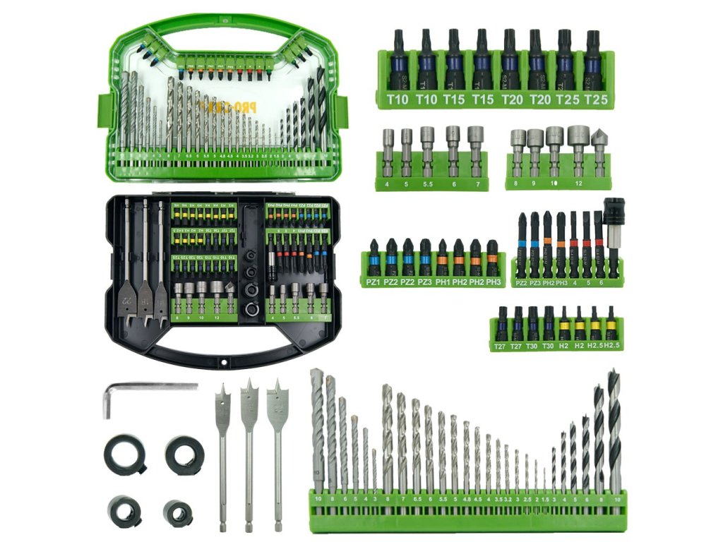 Kompletní výbava pro vrtání i šroubování: Obsahuje vrtáky do kovu (HSS), zdiva, dřeva i ploché vrtáky