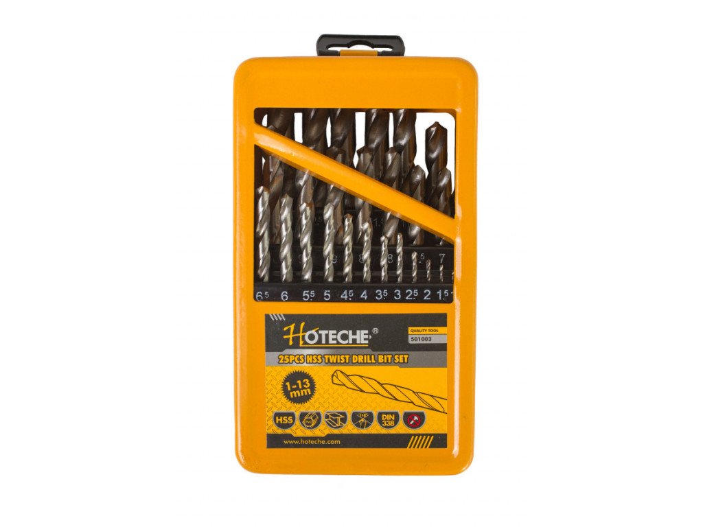 Sada vrtáků do kovu značky Hoteche z rychlořezné oceli HSS nesmí chybět v základní výbavě u žádné Stolní vrtačky i Ruční elektrické vrtačky. Sada je přehledně uložena v kovovém boxu, ve kterém naleznete 25 kusů vrtáků o velikostech 1 - 13 mm.