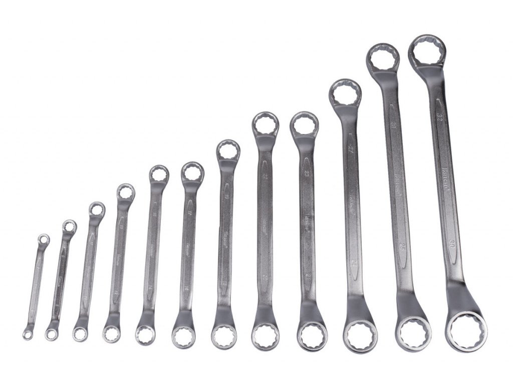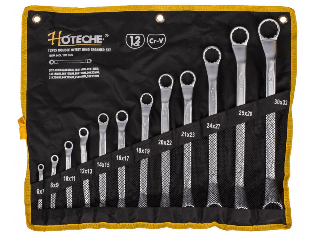Vyhnuté očkové klíče v 12 ks sadě, která je přehledně uložena ve srolovatelném pouzdře. Díky srolování je pak sada úspornější na skladovací prostor a hodí se jak na cesty, tak na montáže. Klíče jsou vyrobeny z kvalitní chrom-vanadiové oceli.