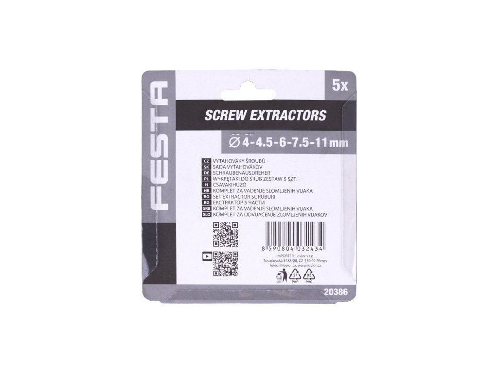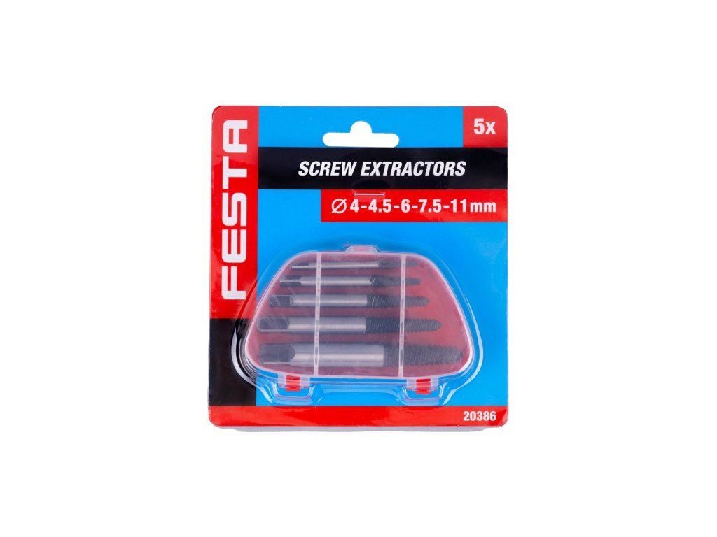 5-ti dílná sada vytahováků šroubů FESTA, použití: k vytahování zlomených a zalomených šroubů, závitových tyčí...., nutné předvrtání, díky opačné šroubovici postupným zavrtáním do otvoru dojde k vyšroubování - popř. vytočení zalomeného dílu, pro profesionální použití, rozměry: 4, 4.5, 6, 7.5, 11 mm, praktický plastový box pro uložení.