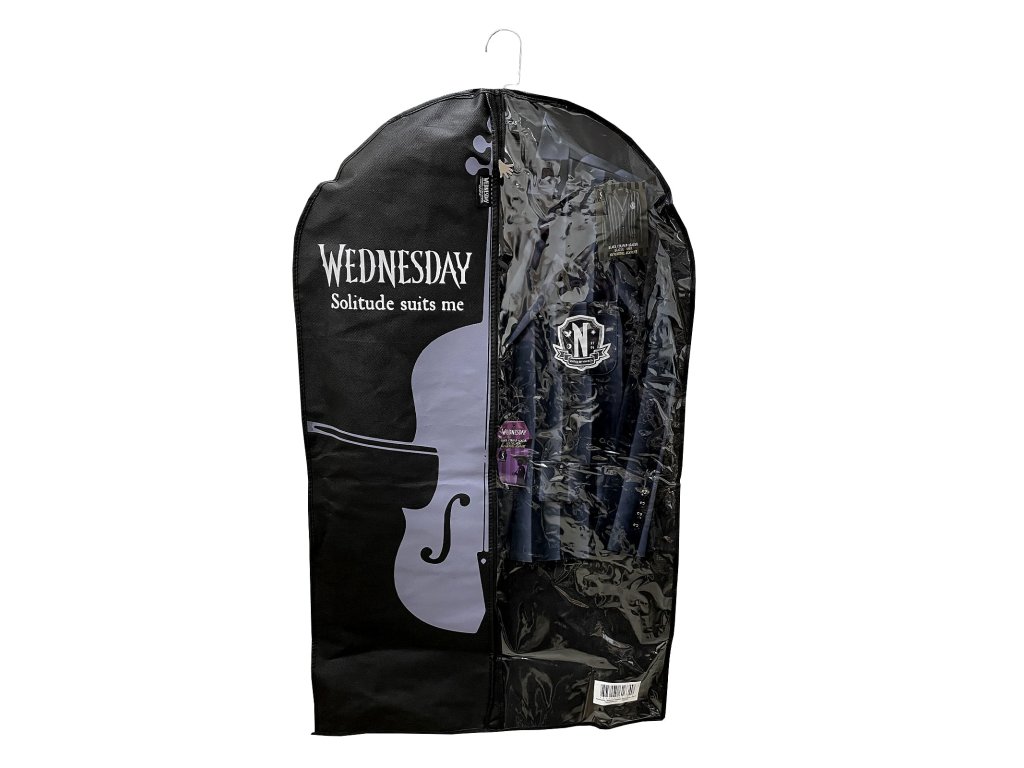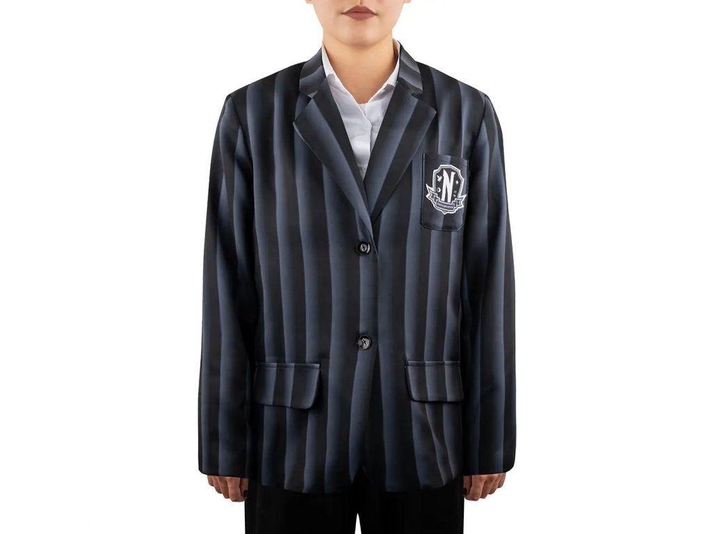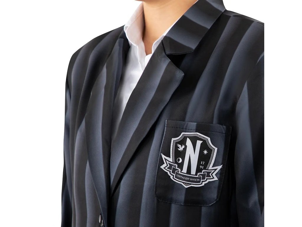 Černé sako, jaké nosila Wednesday Addamsová v oblíbeném seriálu od Netflixu, využijete jako součást kostýmu nebo pro cosplay. Na saku nechybí náprsní kapsa se znakem Nevermore Academy. Boční kapsičky nejsou funkční, jen dekorační. Součástí jsou ramenní vycpávky, ochranný obal a ramínko na zavěšení. Sako jsme pro vás ručně přeměřili.