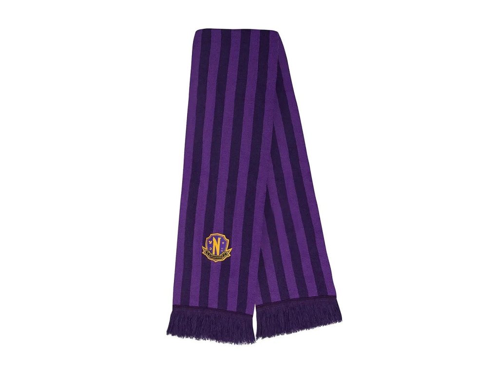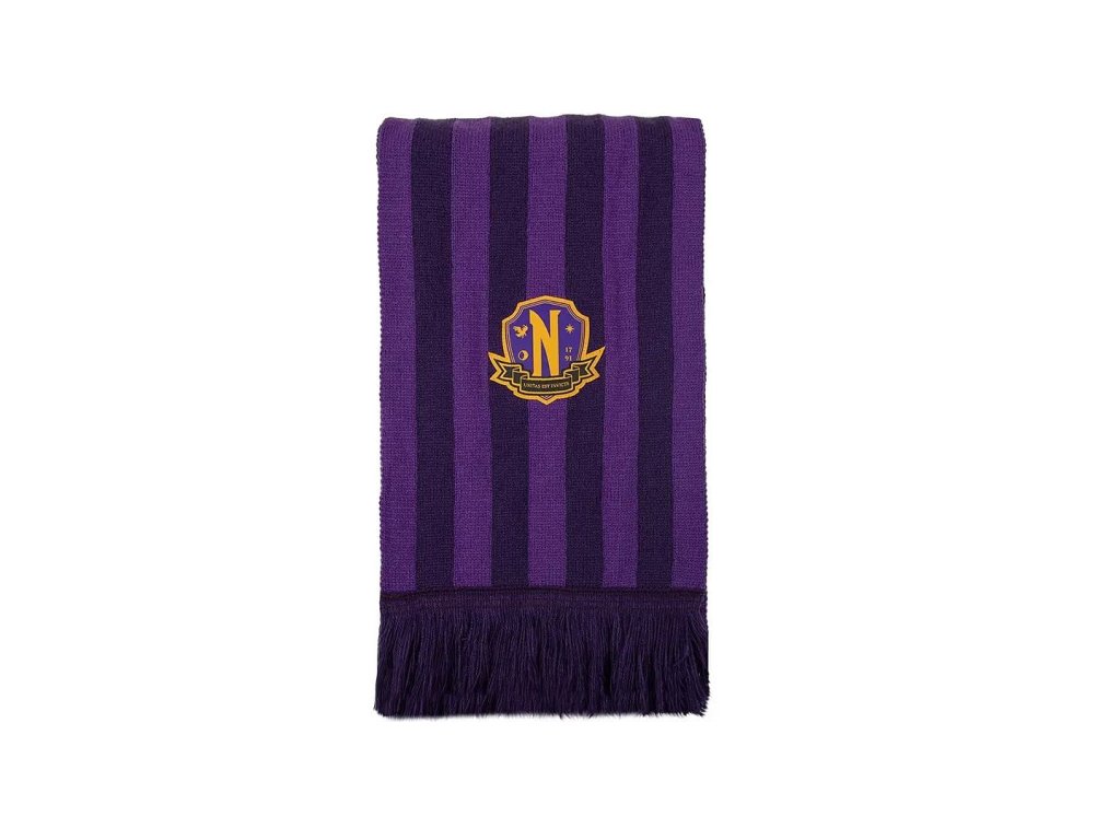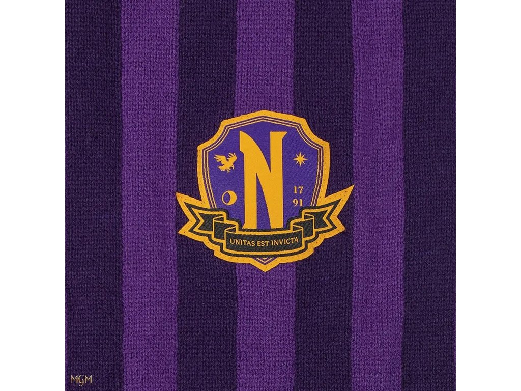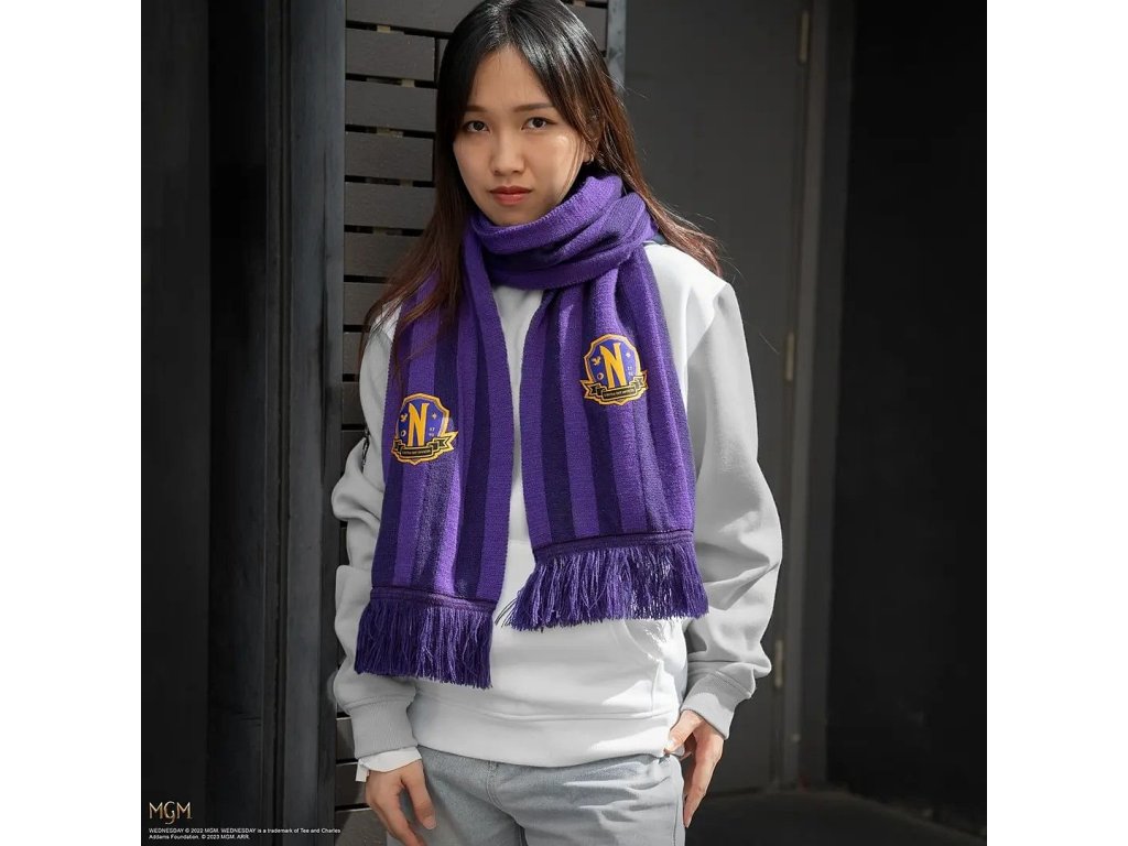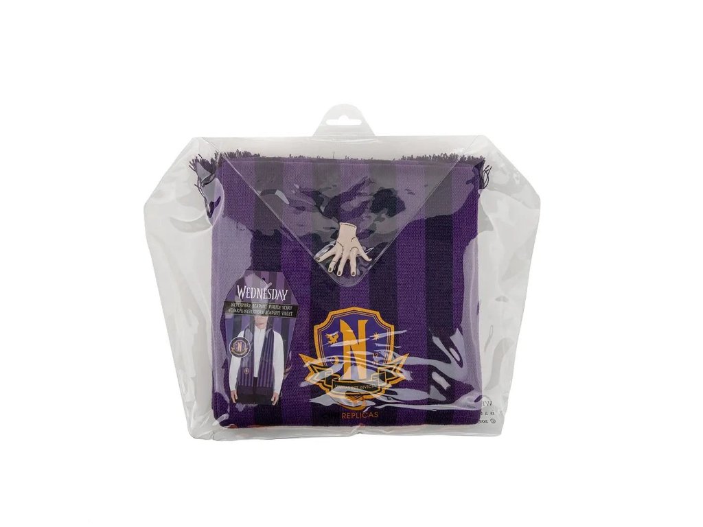 Hezká fialová šála se znakem Nevermore Academy ze seriálu Wednesday vám bude slušet! Jedinečný doplněk vašeho oblečení či kostýmu! Baleno ve stylové průhledné tašce, kterou lze použít jako psaníčko.