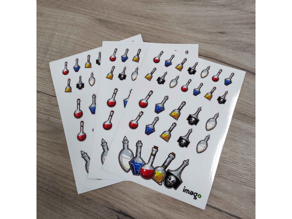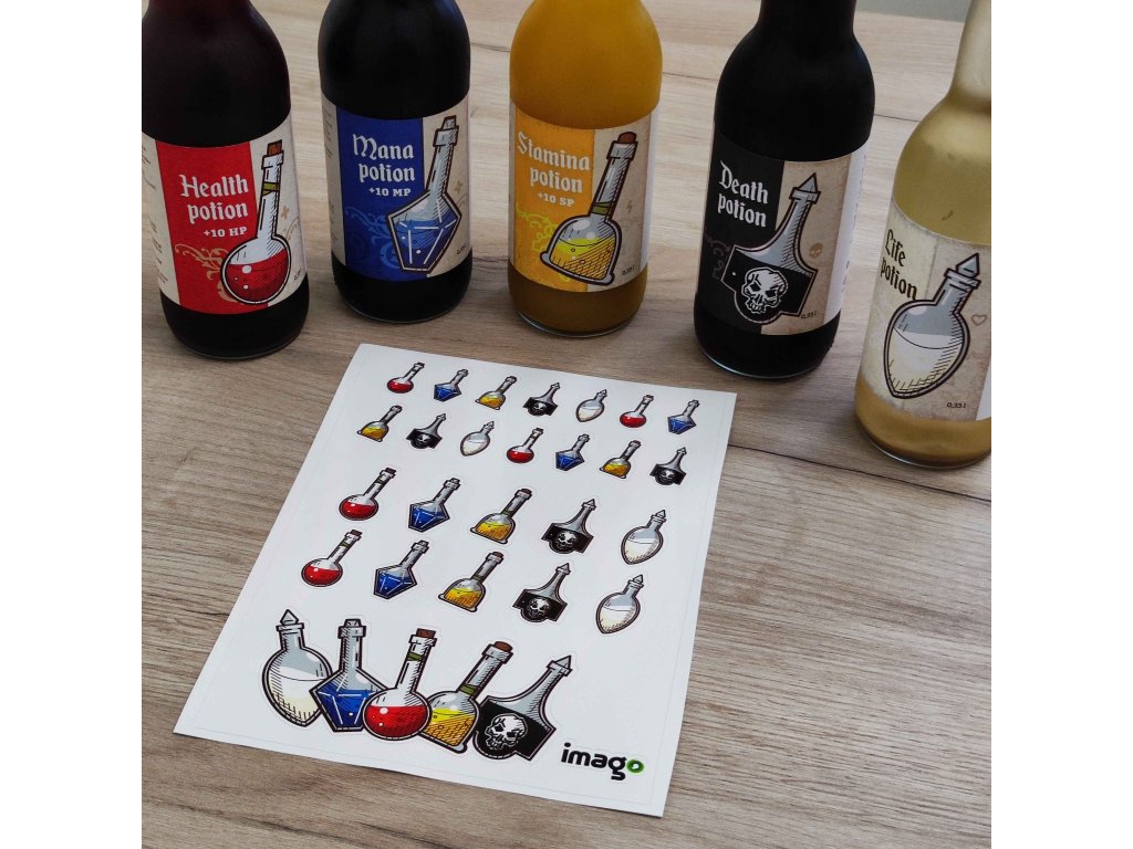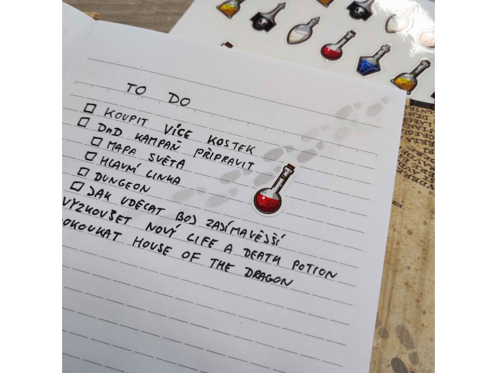 Přidej špetku magie do svého každodenního života s našimi samolepkami potionů! Inspirací pro tyto jedinečné samolepky byly naše originální nápoje – Life potion, Stamina potion Death potion, Mana potion a Health potion. Každá z nich nese symboliku, kterou můžeš v TTRPG vylepšit svůj diář nebo zápisník, nebo přidat trochu fantazie do školních či pracovních pomůcek, tyto samolepky ti pomohou vytvořit kouzelnou atmosféru. Samolepky potionů jsou navrženy tak, aby přinesly radost a kousek fantasy světa do každodenních činností. Jsou ideální pro fanoušky her, kteří chtějí mít svůj oblíbený svět vždy na dosah ruky, nebo pro ty, kteří chtějí jednoduše ozvláštnit své běžné poznámky. Vyjádři svou kreativitu a vášeň pro dobrodružství s těmito stylovými a praktickými samolepkami! Samolepky jsou kvalitní s pvc polymer laminací. Rozměr archu: A5 Nejmenší samolepky: cca 1,5 x 2,5 cm Větší samolepky: cca 2 x 3,5 cm Největší samolepka: 10,5 x 5,5 cm