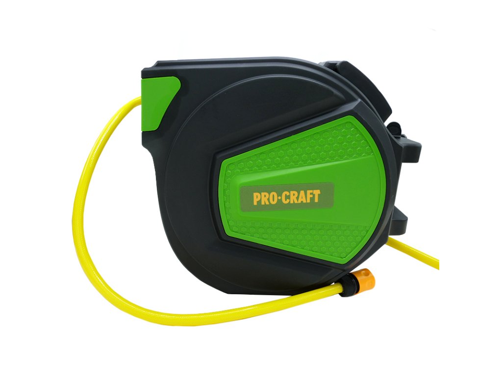 Samonavíjecí buben se zahradní hadicí Procraft VK20 Délka hadice 20 m Kvalitní flexibilní opletená hadice PVC Pracovní tlak 8 bar Vnitřní průměr hadice 1/2" Velikost rychlospojek 3/4 ABS