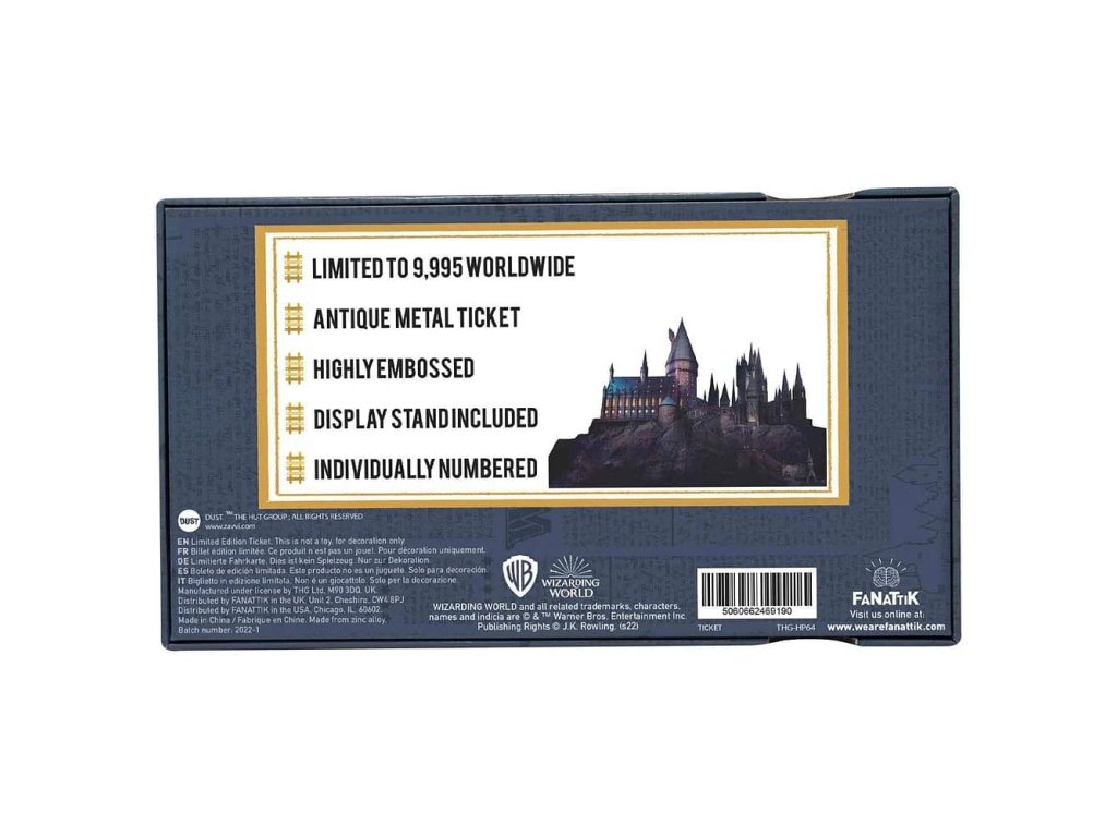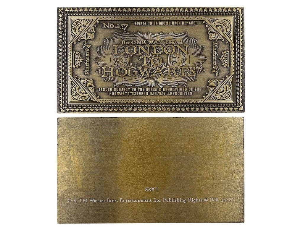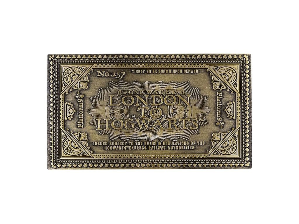Kovová replika jízdenky na Bradavický expres vás vypraví do magického světa Harry Pottera! Sběratelská jízdenka udělá radost fanouškům příběhů kouzelníků z Bradavic. Jedná se o celosvětově limitovanou edici 9 995 ks, každý kus je individuálně očíslován.