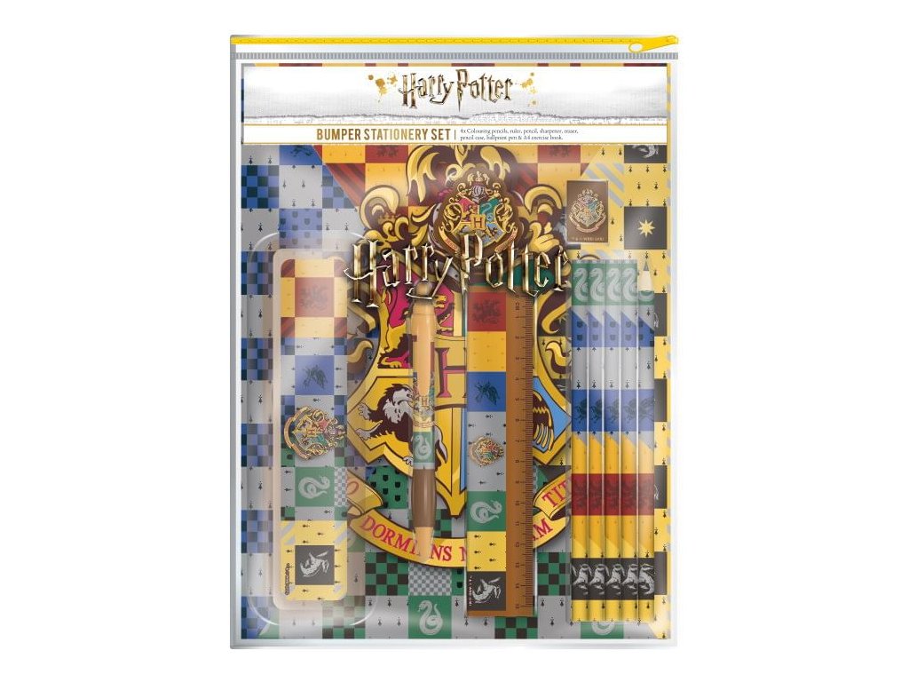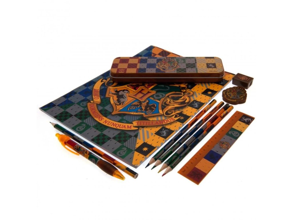 Tato krásná sada potřeb pro školáky v sobě ukrývá 11 užitečných předmětů s grafikou a obrázky z příběhů o Harry Potterovi. Penál, tužku, propisku, pastelky (červená, žlutá, zelená, modrá), 15cm pravítko, ořezávátko, gumu a linkovaný blok formátu A4. Vše zdobí znaky bradavických kolejí Nebelvír, Mrzimor, Havraspár a Zmijozel.