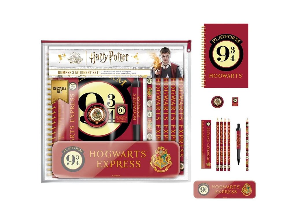 Praktická sada psacích a školních potřeb ve stylu Harryho Pottera se hodí pro malé i velké čarodějky a mágy. Soupravu zdobí grafika Nástupiště 9 a 3/4 a najdete v ní linkovaný zápisník v kroužkové vazbě, penál na tužky, propisku, 4 barevné pastelky, tužku, pravítko, gumu a ořezávátko.