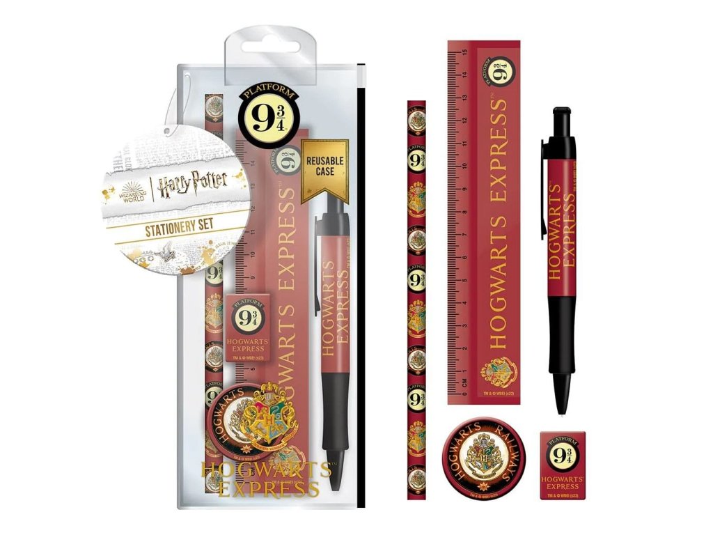 Sada školních potřeb pro fanoušky Harryho Pottera obsahuje propisku, tužku, pravítko, ořezávátko a gumu - to vše v grafice Nástupiště 9 a 3/4. Nutná výbava na nový školní rok každého kouzelníka i čarodějky.