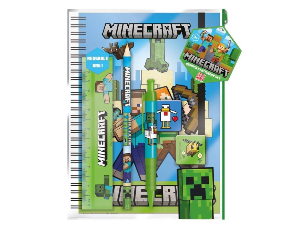 Zaboř krumpáč do učení se stylovou výbavou z Minecraftu! Tato sada školních potřeb (6 ks) je ideální pro všechny malé hráče kostičkované populární hry. Každý kousek je ozdoben motivy z Minecraftu, takže si školu užiješ s oblíbenými postavami jako je Alex, Steve a nebo Creeper. Skvělý dárek pro malé stavitele a dobrodruhy. Balení obsahuje: 1x linkovaný zápisník A5 1x tužka 1x ořezávátko 1x pravítko 1x kuličkové pero 1x guma