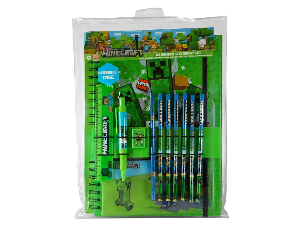 Se sadou školních potřeb pro hráče Minecraftu se staneš tím správným Bossem! Sada potřeb s postavami Alex, Stevem a Creeprem doplněné o další herní detaily si můžeš vzít v praktickém pouzdru do školy i kanceláře. Skvělé pro milovníky světa z kostiček. Obsah balení: 1x linkovaný zápisník 1x tužka 1x ořezávátko 1x pravítko 1x kuličkové pero 1x penál na tužky 6x barevných pastelek