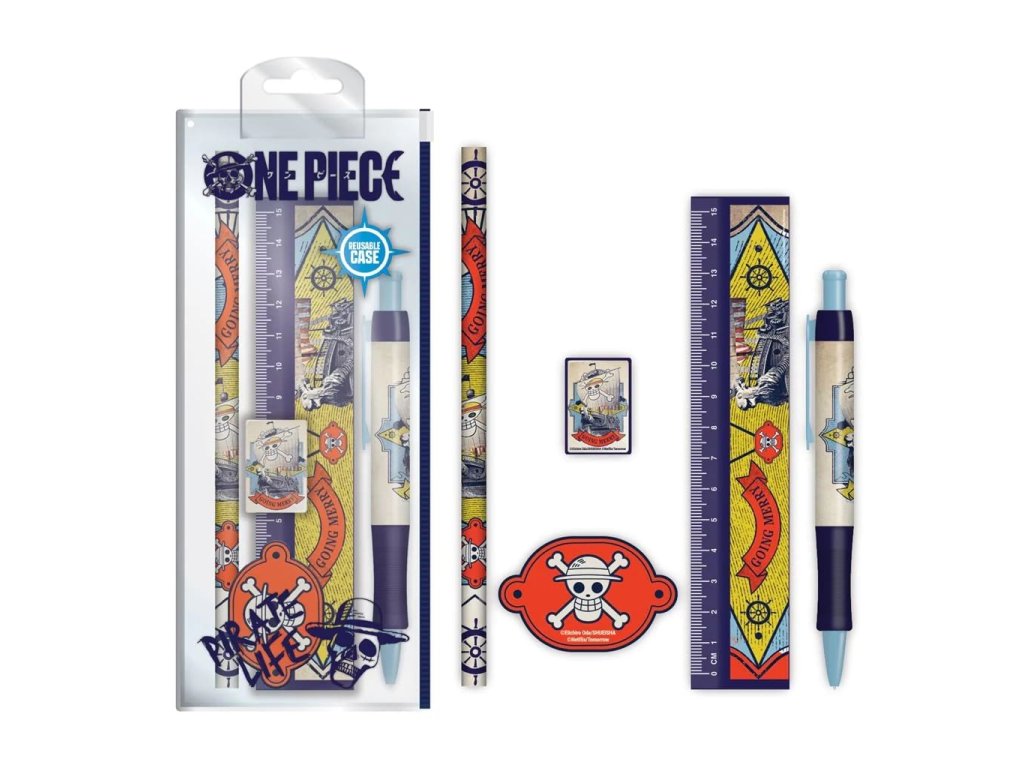 Originální sada školních potřeb pro fanoušky dobrodružného fantasy seriálu One Piece obsahuje pravítko, propisku, tužku, gumu a ořezávátko. Vše najdeš v průhledném uzavíratelném a znovupoužitelném pouzdru.