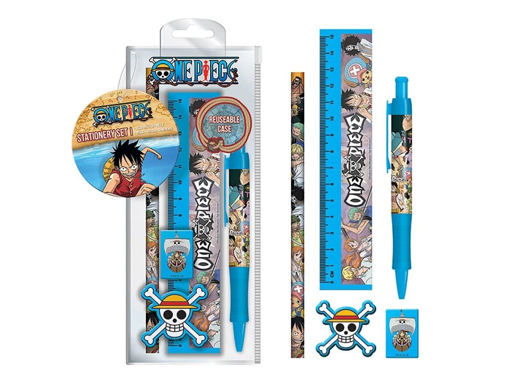 V sadě školních potřeb s grafikou Luffyho a jeho přátel z japonské mangy One Piece najdeš pravítko, propisku, gumu, ořezávátko a tužku. Celá sada je balena ve znovu použitelném, plastovém, průhledném obalu, vhodném třeba jako malé pouzdro.