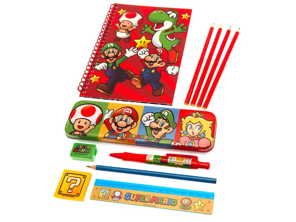 Sada školních potřeb pro hráče konzolových her od Nintenda a fanoušky Super Maria, Luigiho a jejich přátel obsahuje: kovový penál na tužky, zápisník (formát A5), 4 pastelky, kuličkové pero, propisku, pravítko a ořezávátko. Skvělé nejen pro zaznamenávání vašeho herního skóre!