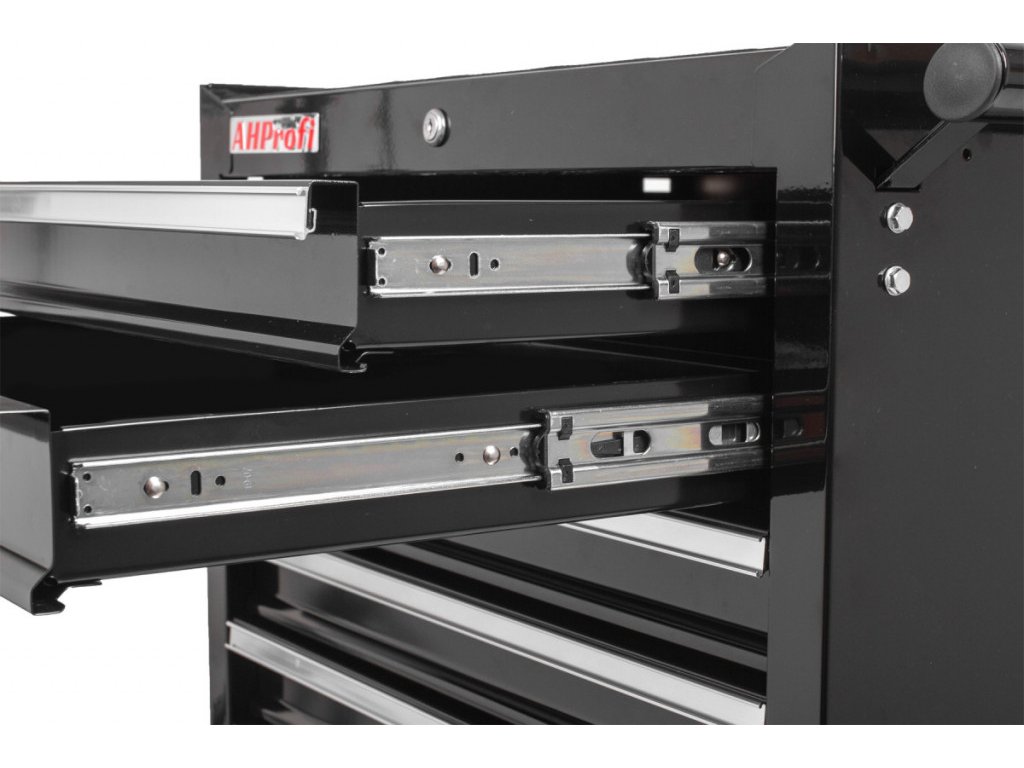 Pojízdná skříňka v přepychovém černém provedení se 7 zásuvkami, které jsou samozřejmě opatřeny kuličkovými pojezdy a zajištěny proti neúmyslnému vysunutí, se stane hvězdou jakékoli dílny.