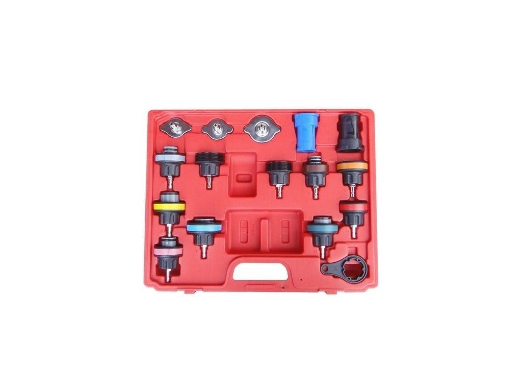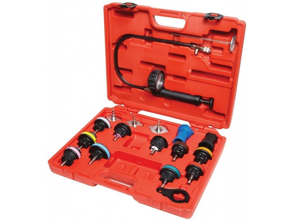 Souprava pro snadnou a rychlou kontrolu netěsností chladícího okruhu pomocí tlaku vzduchu. Cr-Mo materiál hlavic pro vozy Toyota, Honda, Ford, VW, Audi, Volvo, Mercedes-Benz, Bmw, Renault, Fiat, Opel, Peugeot, Jeep, Citroën a další vozy + nákladní vozy.