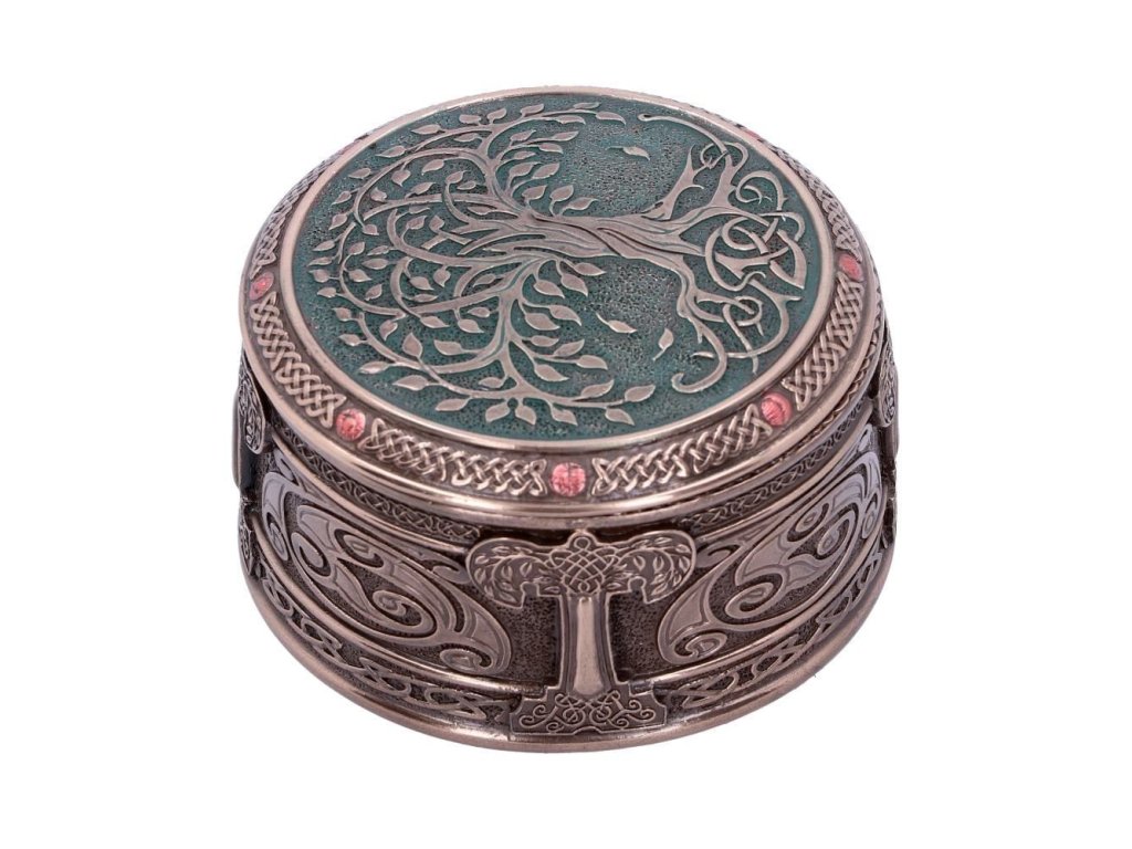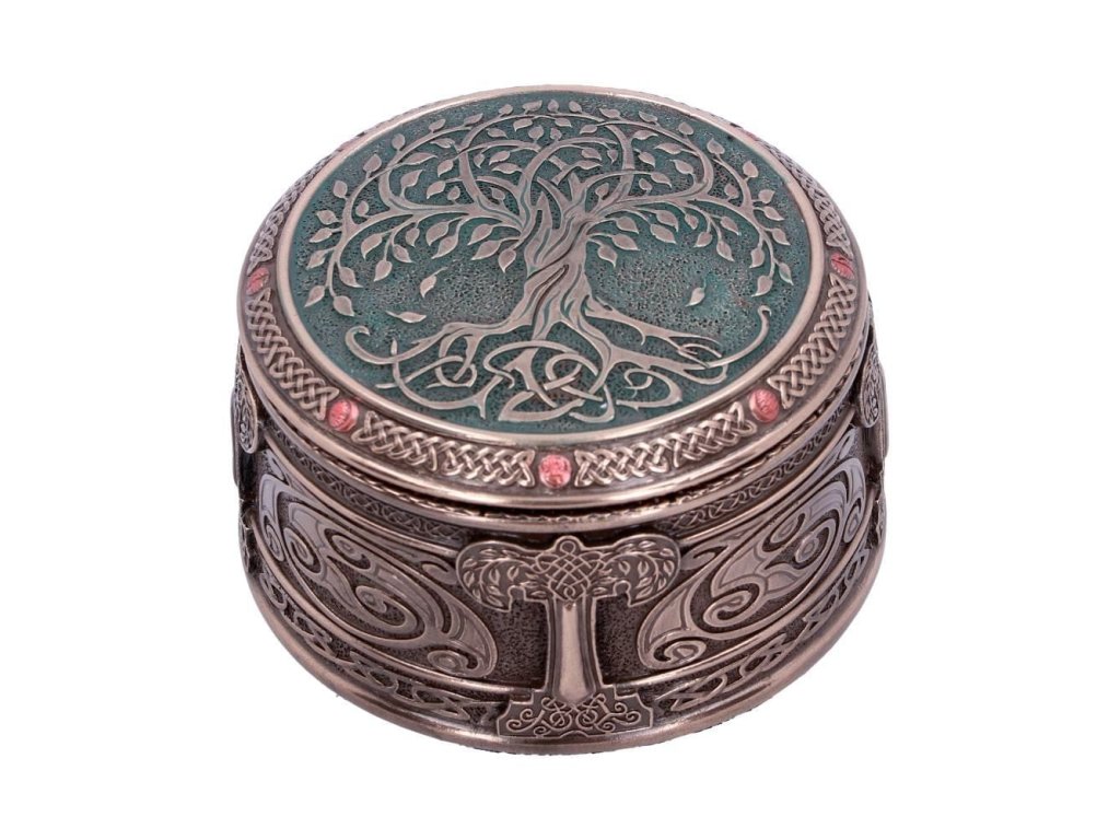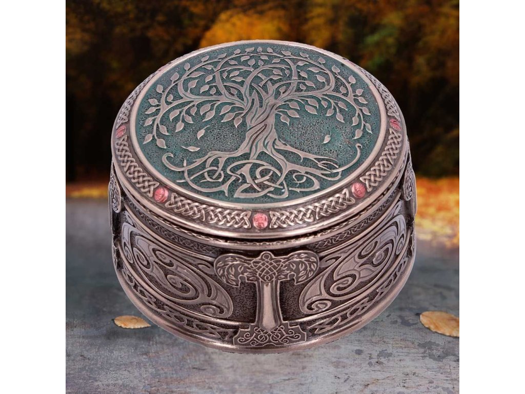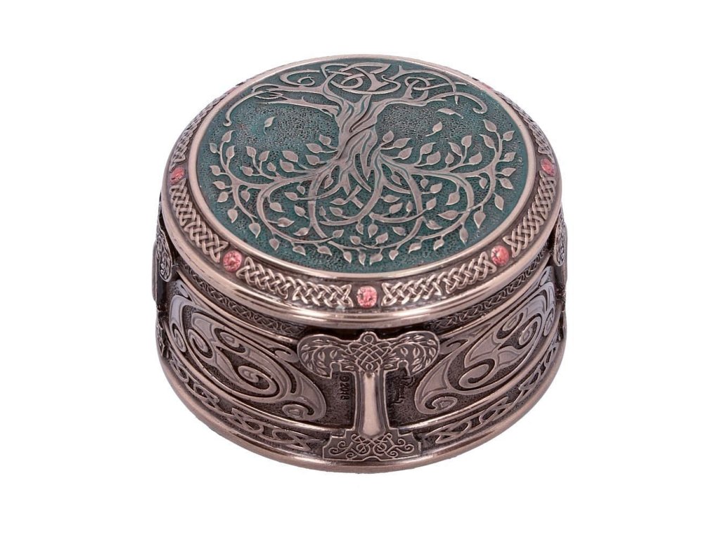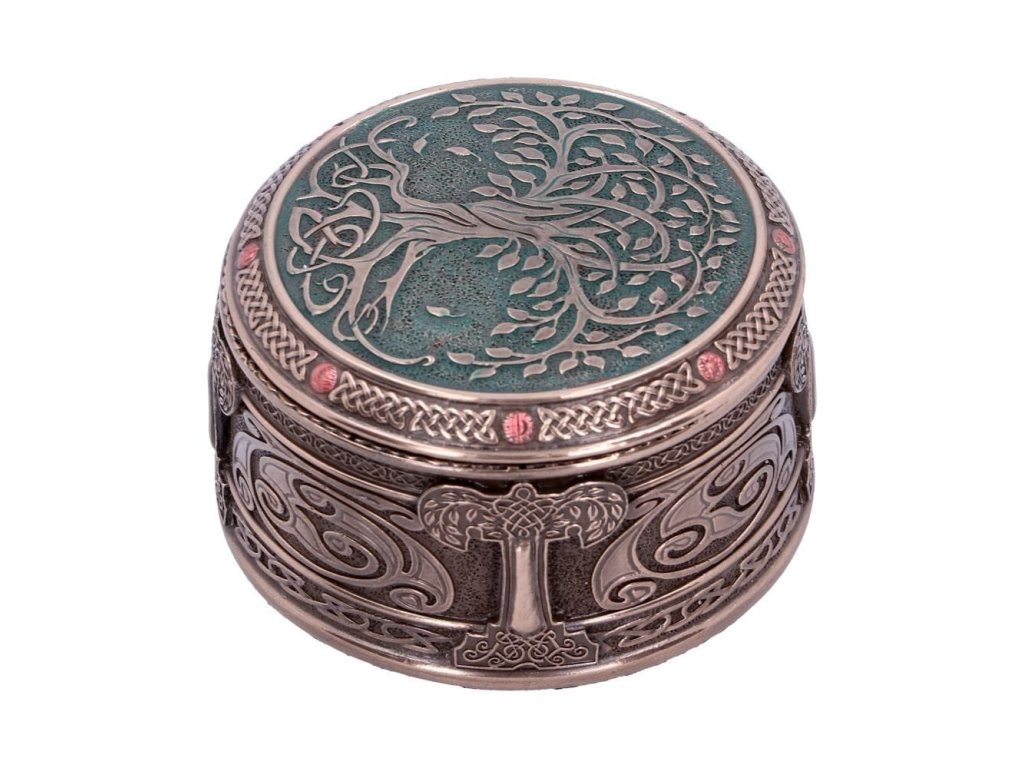 Stylová šperkovnice zdobená keltskými motivy a Stromem života vyobrazeným na víku, bude krásným doplňkem domácnosti. Vnitřní průměr je 8 cm, hloubka 3 cm.