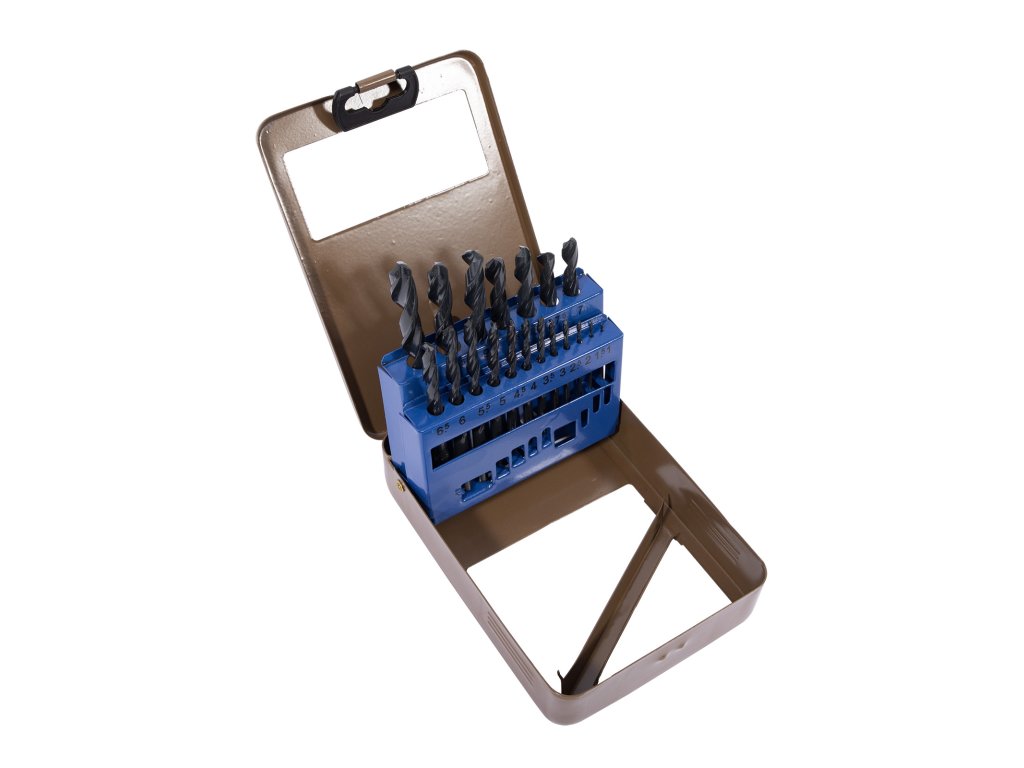 Sada vrtáků do kovu vyrobených z HSS oceli. Vrtáky jsou uloženy v kovovém boxu. Lze opětovně brousit.