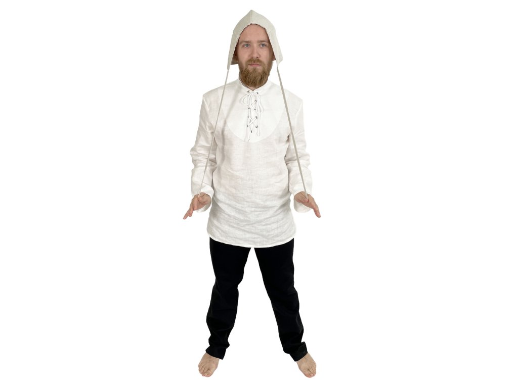 Středověká lněná čepice je praktický a věrně rekonstruovaný doplněk, vhodný pro historický kostým, larp nebo jen pohodlné nošení pod kapuci či helmici. Ušitá je z pevné, ale příjemné směsové látky – len v útku, bavlna v osnově zajišťují přirozený vzhled a komfort. Čepice skvěle ladí k našim novým bruchům a vytváří tak základní, ale stylově sjednocený komplet do středověké domácnosti, na tržiště nebo pod zbroj.