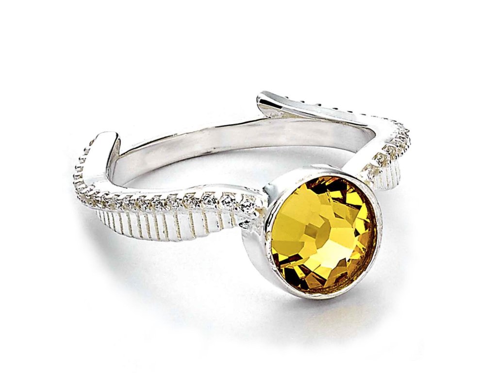 Nádherný stříbrný prsten s krystaly má podobu famfrpálové Zlatonky z knih a filmů o Harry Potterovi z Bradavic. Nechte Zlatonku obtočit váš prst! Skvělý dárek pro fanoušky magického světa J. K. Rowlingové. Dodáváme ve stylové dárkové krabičce. Žlutý krystal má v průměru 7 mm. Velikosti: S - vnitřní průměr 15,5 mm M - vnitřní průměr 17 mm L - vnitřní průměr 18,5 mm