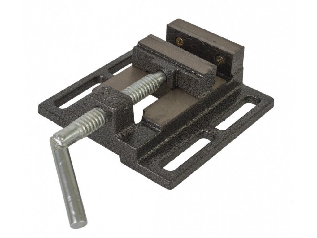Litinový strojní svěrák, určený k montáži na pracovní stoly nebo pod stojanové vrtačky.