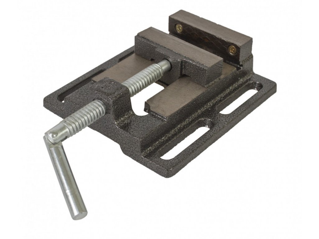 Litinový strojní svěrák, určený k montáži na pracovní stoly nebo pod stojanové vrtačky.