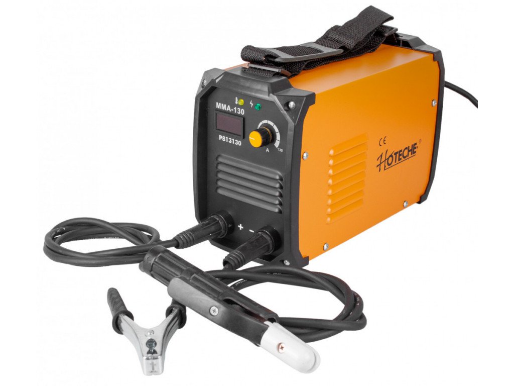 Možnost plynulého nastavování proudu 10 - 130 A. Součástí balení je svářecí kukla a drátěný kartáč s kladívkem.