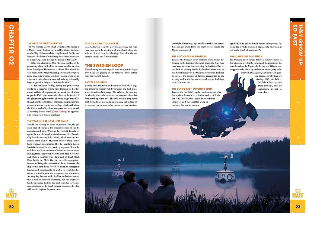 Nádherně ilustrovaná kniha v pevné vazbě pro RPG Tales From the Loop v sobě ukrývá příběhovou kampaň, která je složena ze čtyř Tajemství. Vypravíte se do Smyčky Norfolk Broads ve Spojeném království – příručka vám poskytně všechny nezbytné informace o Smyčce i jejím okolí. Vžijte se do kůže dětí, které čekají neobyčejné příběhy a jejich kempování se změní v něco mnohem zajímavějšího. Zjistíte, že přátelé přicházeji ve všech tvarech, velikostech a ne vždy musí pocházet z našeho světa. Vydejte se na nezapomenutelné dobrodružství. Příručka je v angličtině. Everything changed on that fateful day. Looking back, I know that whatever we did changed our lives forever. The sky ruptured and something strange came through. It was a great adventure that showed us how little we knew about the universe. It was scary and yet magical. I wish we could do it again. In these four adventures, that together forms a campaign spanning the seasons of a year, the Kids will be tested to the limits of their abilities. When an ordinary camping trip turns into something else, they will discover that friends come in all sizes and forms, and even from different worlds. Together they will go on an adventure they will never forget. This book includes: A four-part campaign taking place in the UK Loop of Norfolk Broads Extensive information on the Norfolk Broads Loop and the area surrounding it Tips on how to set the campaign in the Swedish and US Loops New art, maps and handouts.