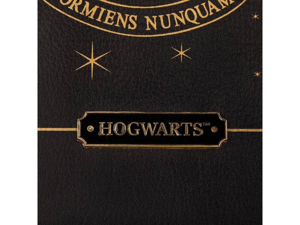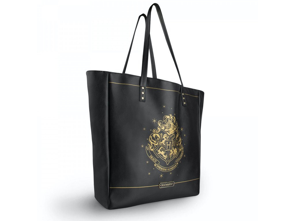 Nádherná černá koženková taška se zlatým bradavickým erbem okouzlí všechny fanynky Harryho Pottera, které potřebují mít dostatek místa na věci při cestě do Bradavic! Taška má velkou hlavní kapsu s menší kapsičkou například na klíče, peněženku nebo mobil. Na spodní straně jsou plastové nožičky, které bráni poškození dna.