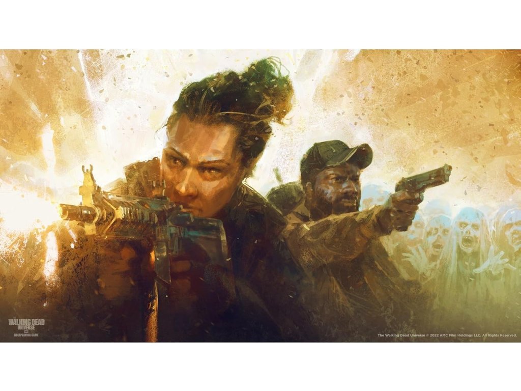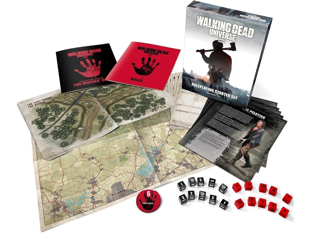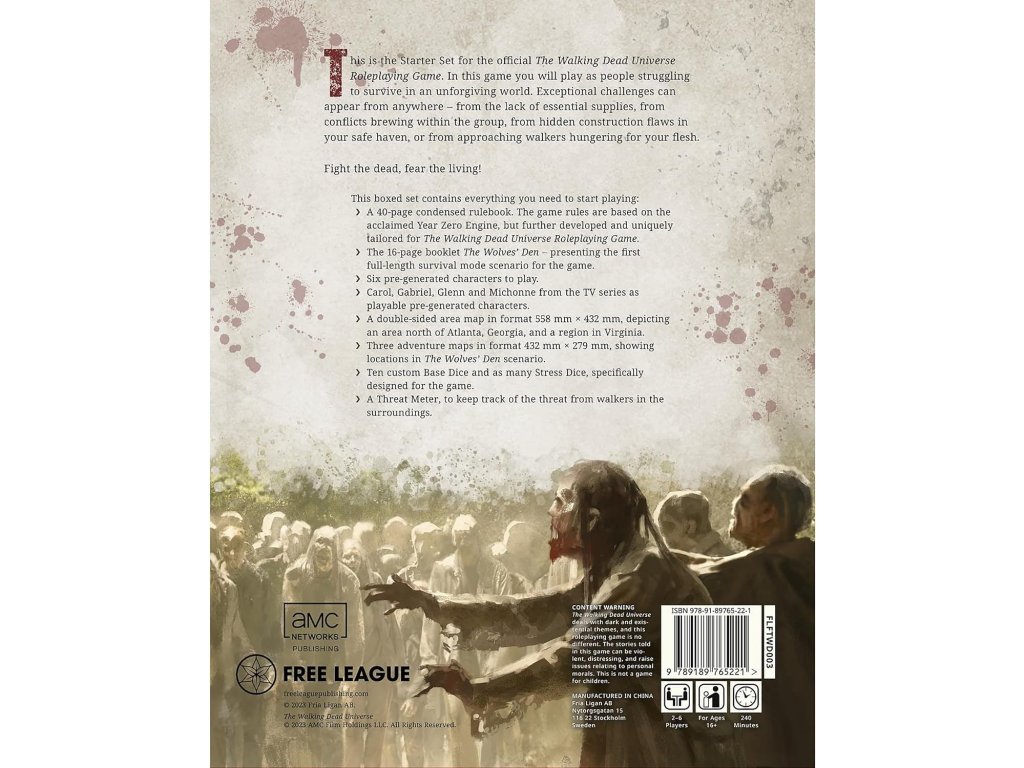 Krabice se startovní sadou pro hru na hrdiny The Walking Dead Universe RPG obsahuje příručku se zkrácenými pravidly, předem vygenerované postavy, herní scénář pro vaše hraní a další příslušenství. Sada je v angličtině. The boxed Starter Set for The Walking Dead Universe RPG includes a condensed rulebook, pre-generated characters and the first full-length survival scenario for you to play. Obsah krabice: STARTER SET CONTAINS a 40-page condensed rulebook. The game rules are based on the acclaimed Year Zero Engine, but further developed and uniquely tailored for The Walking Dead Universe Roleplaying Game. SURVIVAL MODE: The 16-page booklet The Wolves’ Den – presenting the first full‑length survival mode scenario for the game. CHARACTERS: Six pre-generated characters to play, plus Carol, Gabriel, Glenn and Michonne from the TV series as playable pre-generated characters. CUSTOM DICE: Ten custom Base Dice and as many Stress Dice, specifically designed for the game, and a Threat Meter, to keep track of the threat from walkers in the surroundings.