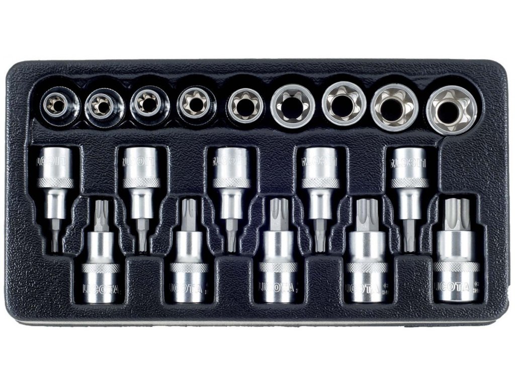 Sada TORX nářadí v plastové výplni montážního vozíku, značka LICOTA, obsahuje hlavice s bitem T20-T70 a TORX nástrčné klíče E10-E24.