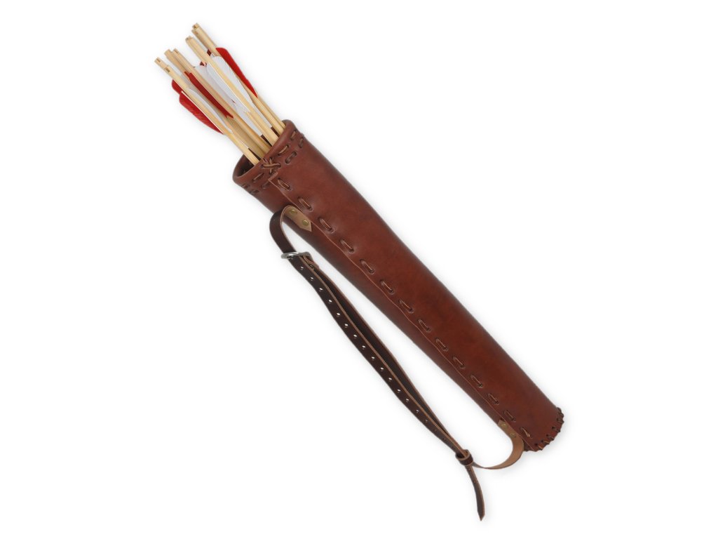 Ručně vyráběný toulec z hovězí kůže určený k nošení přes rameno. Je opatřen stavitelným popruhem, švy jsou svázené koženou tkanicí. Toulce vyrábíme v naší dílně, k mání v různých barevných variantách.