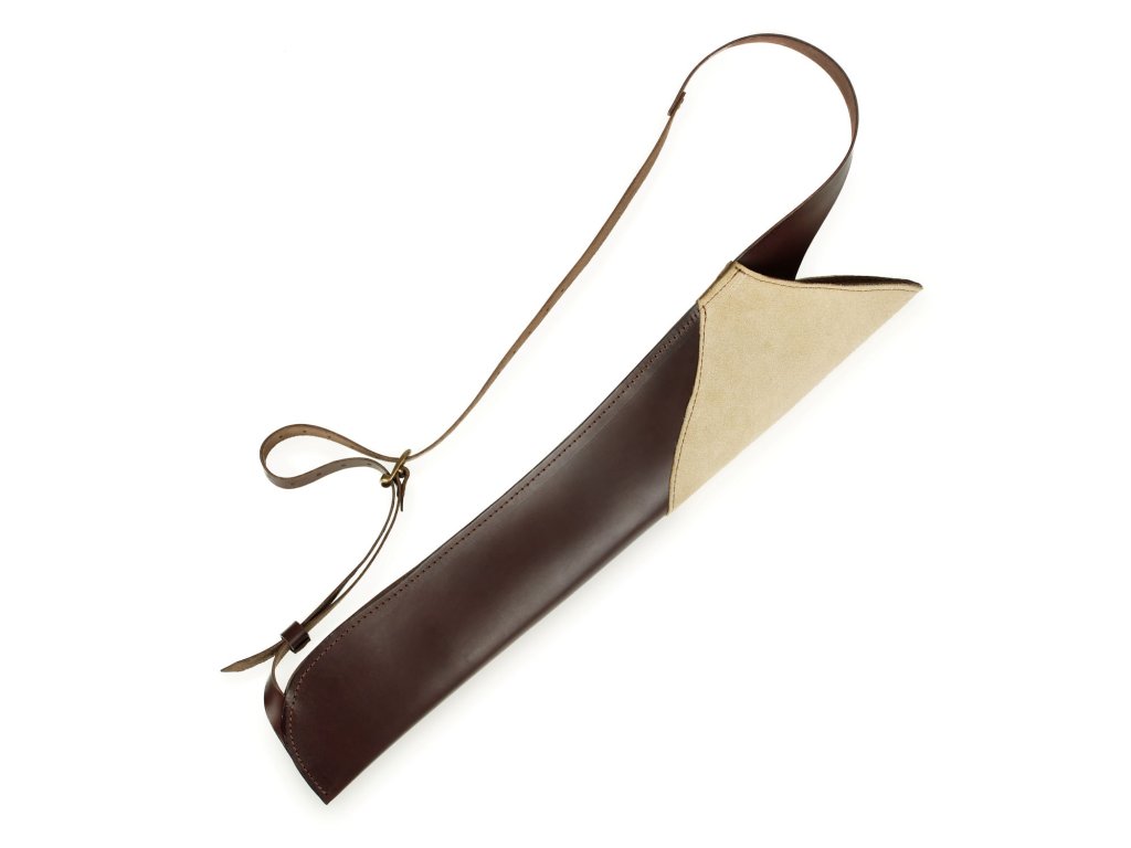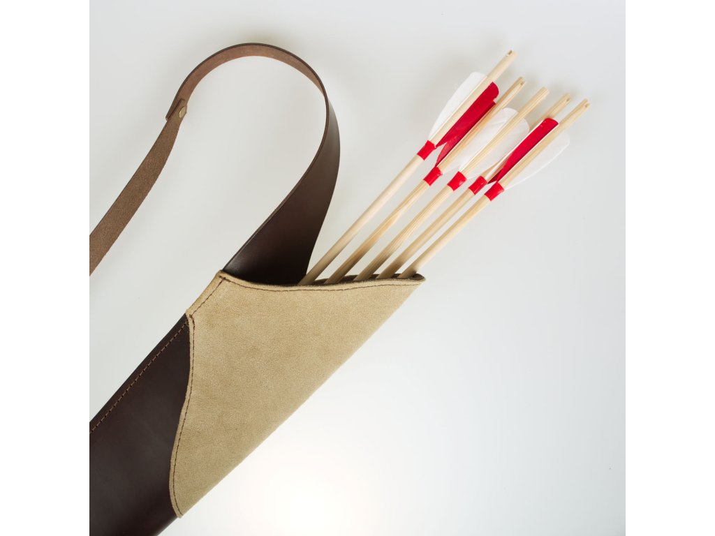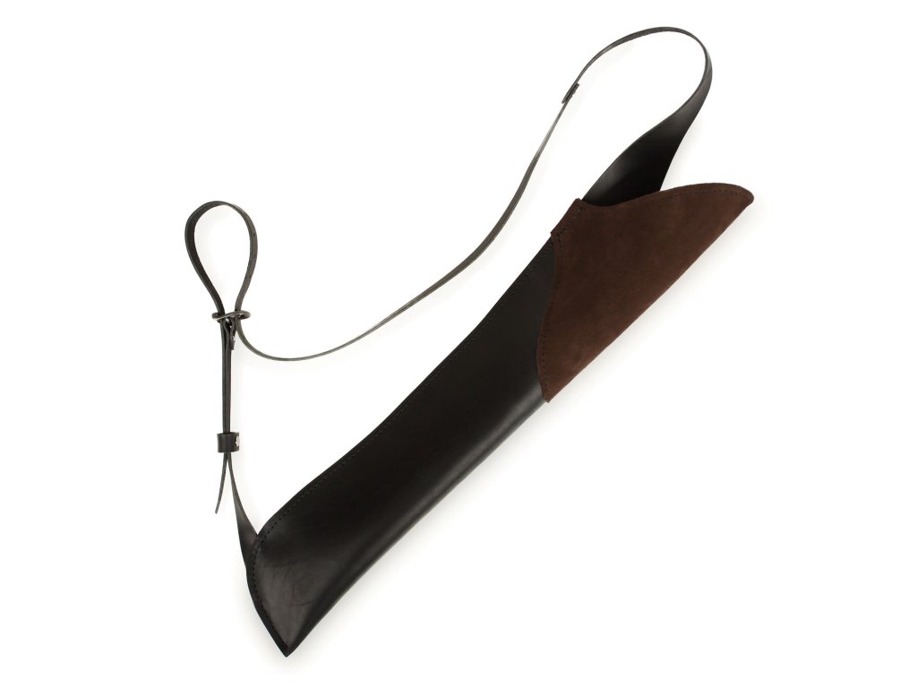 Elegantní zádový toulec vyrobený z hlazené hovězí kůže a šťípané kůže - tzv. štípenky. Popruh na záda je délkově nastavitelný pomocí klasické kovové přezky, bude sedět drobným elfkám i pořádným bojovým lukostřelcům. Pojme pohodlně 15 šípů s hrotem. Vyrábíme ve dvou barevných variantách: hnědá hlazená kůže se světlou štípenkou nebo černá hlazená kůže s hnědou štípenkou. Toulec je na pravé rameno, na přání vyrobíme i obráceně na levé rameno (stačí napsat do poznámky k objednávce).