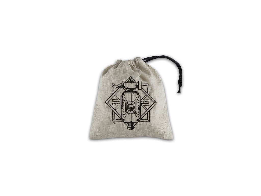 Béžový plátěný stahovací váček na kostky zdobený trpasličími motivy.